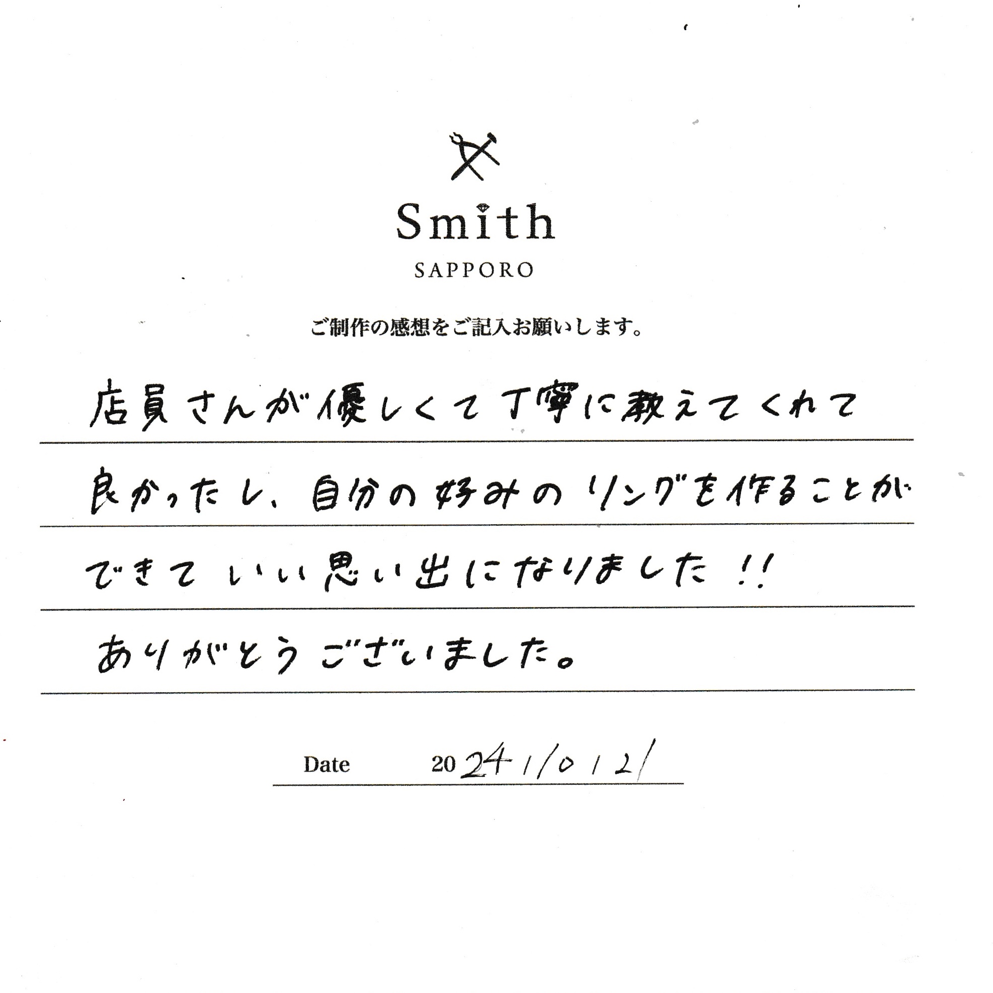 この度は、工房Smith京王プラザホテル札幌店で手作りペアリングのご制作誠にありがとうございました。