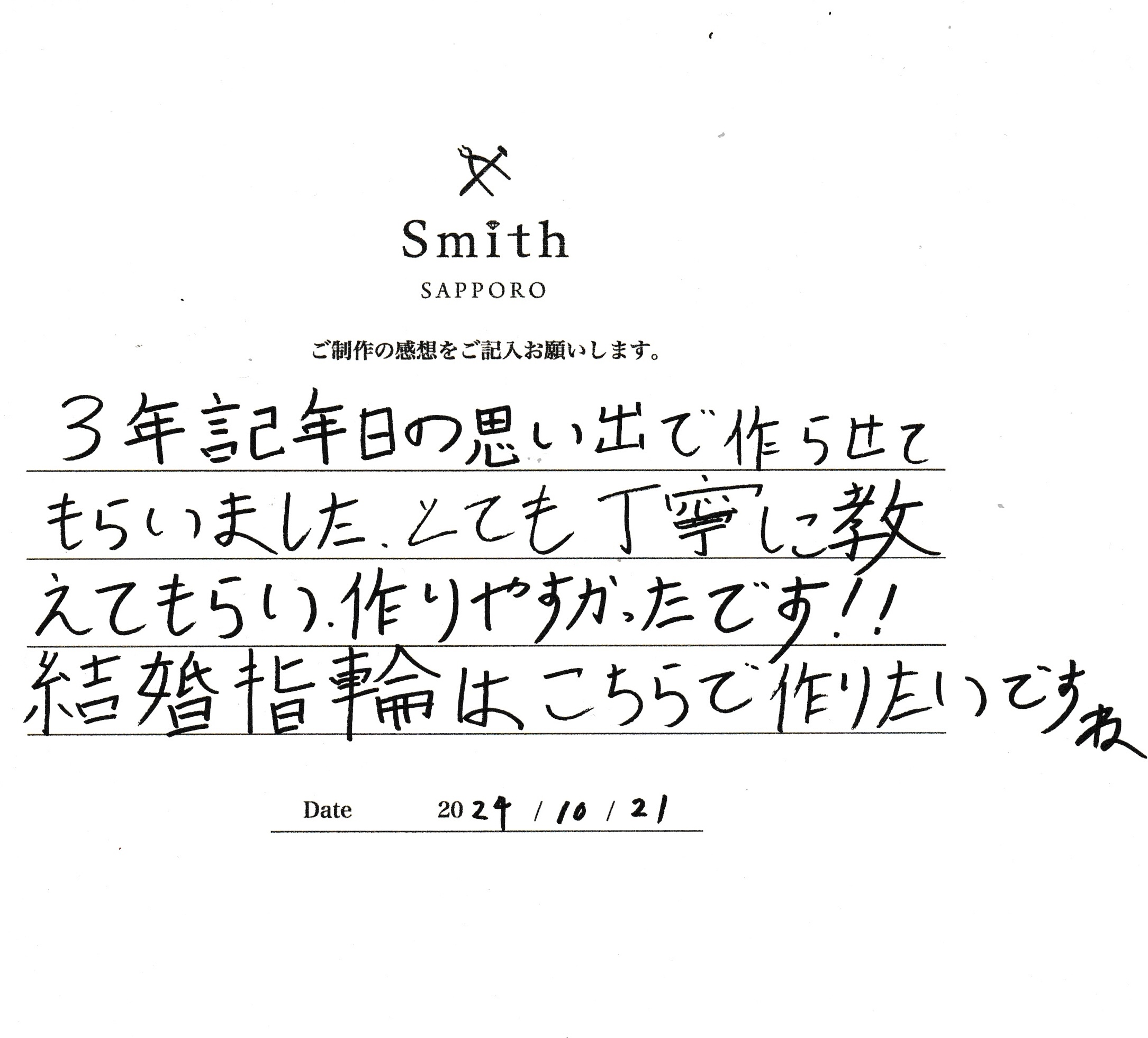 この度は、工房Smith京王プラザホテル札幌店で手作りペアリングのご制作誠にありがとうございました。
