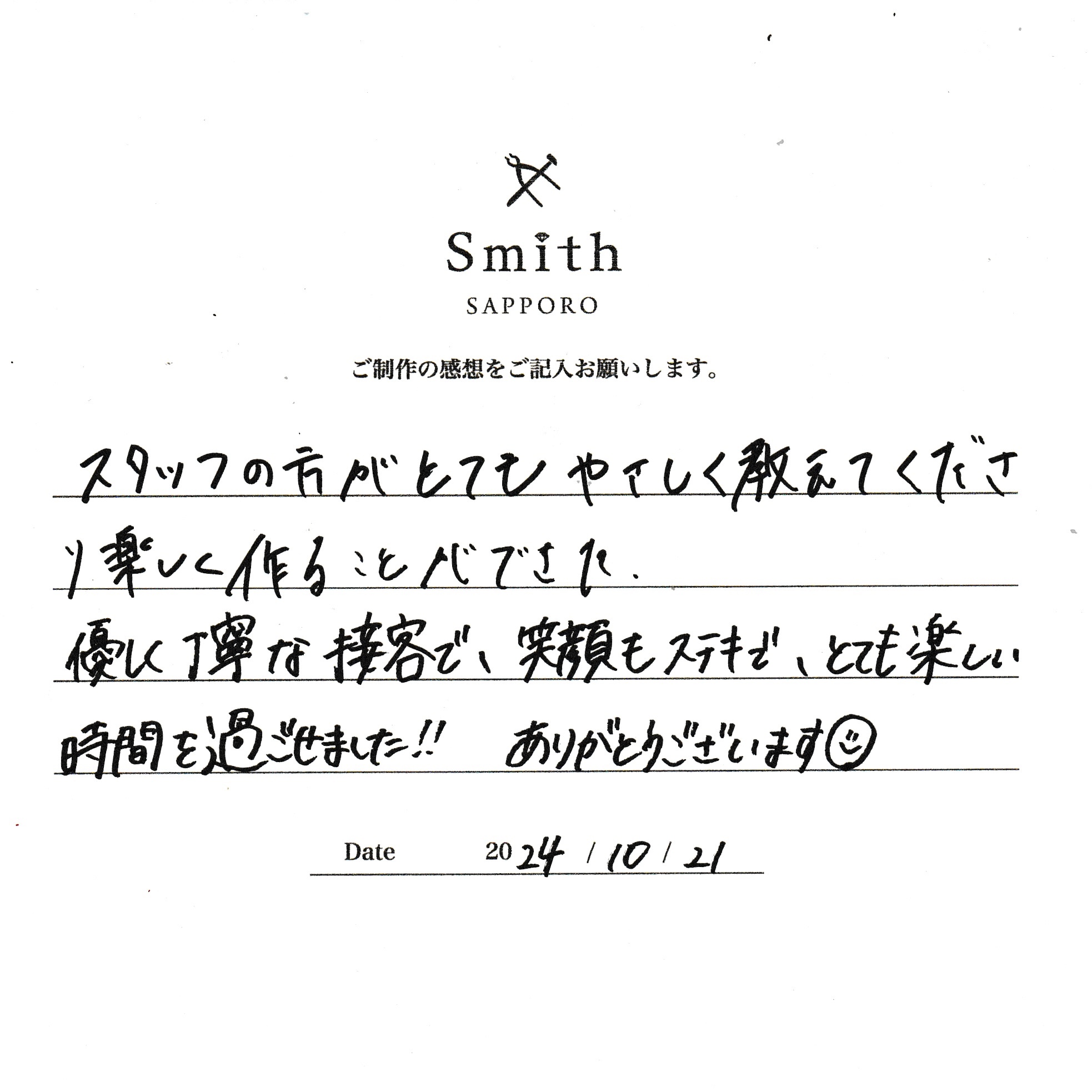 この度は、工房Smith京王プラザホテル札幌店で手作りペアリングのご制作誠にありがとうございました。