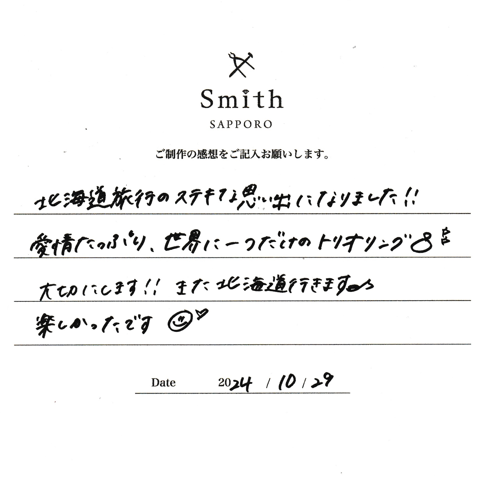 この度は、工房Smith京王プラザホテル札幌店で手作りリングのご制作誠にありがとうございました。