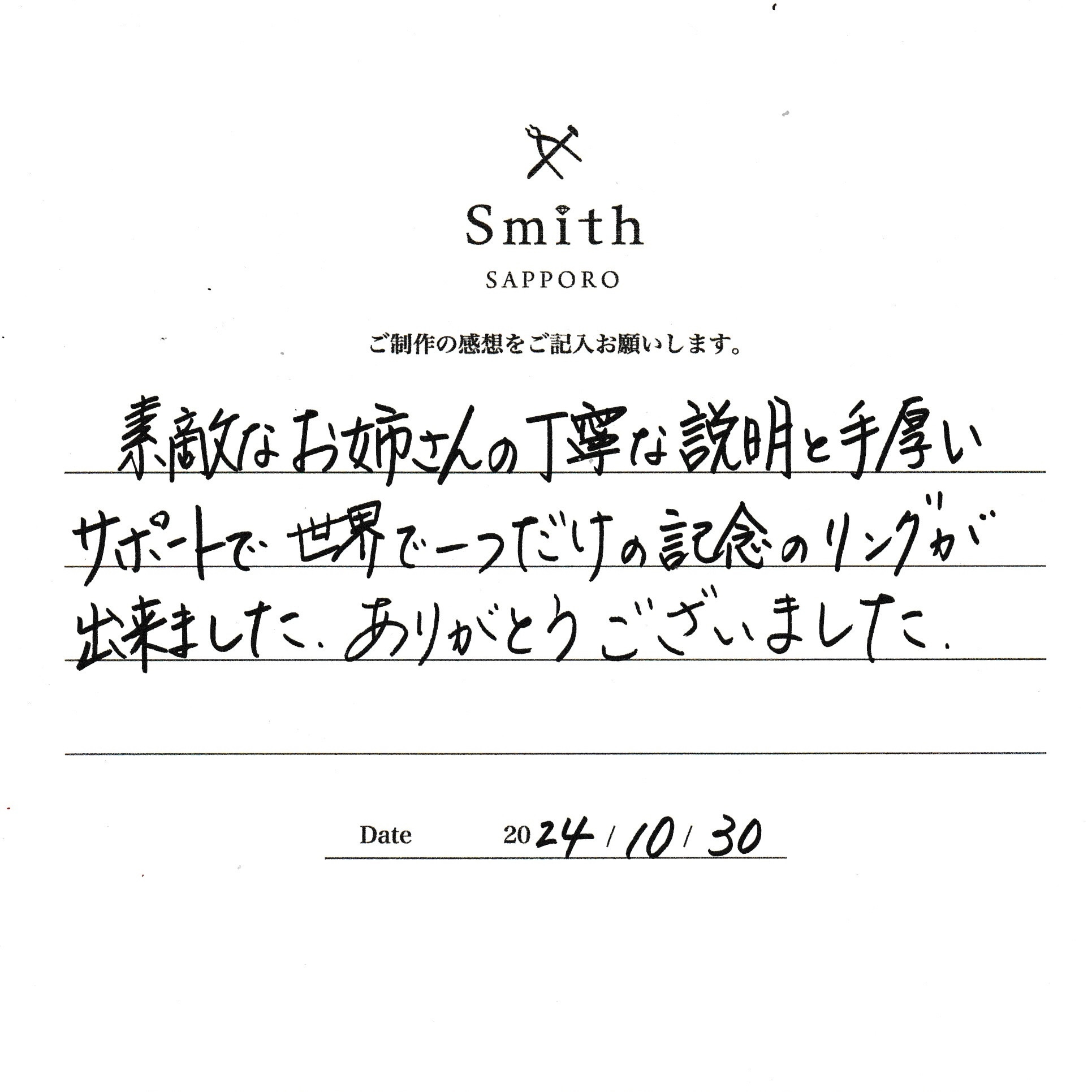 この度は、工房Smith京王プラザホテル札幌店で手作りペアリングのご制作誠にありがとうございました。