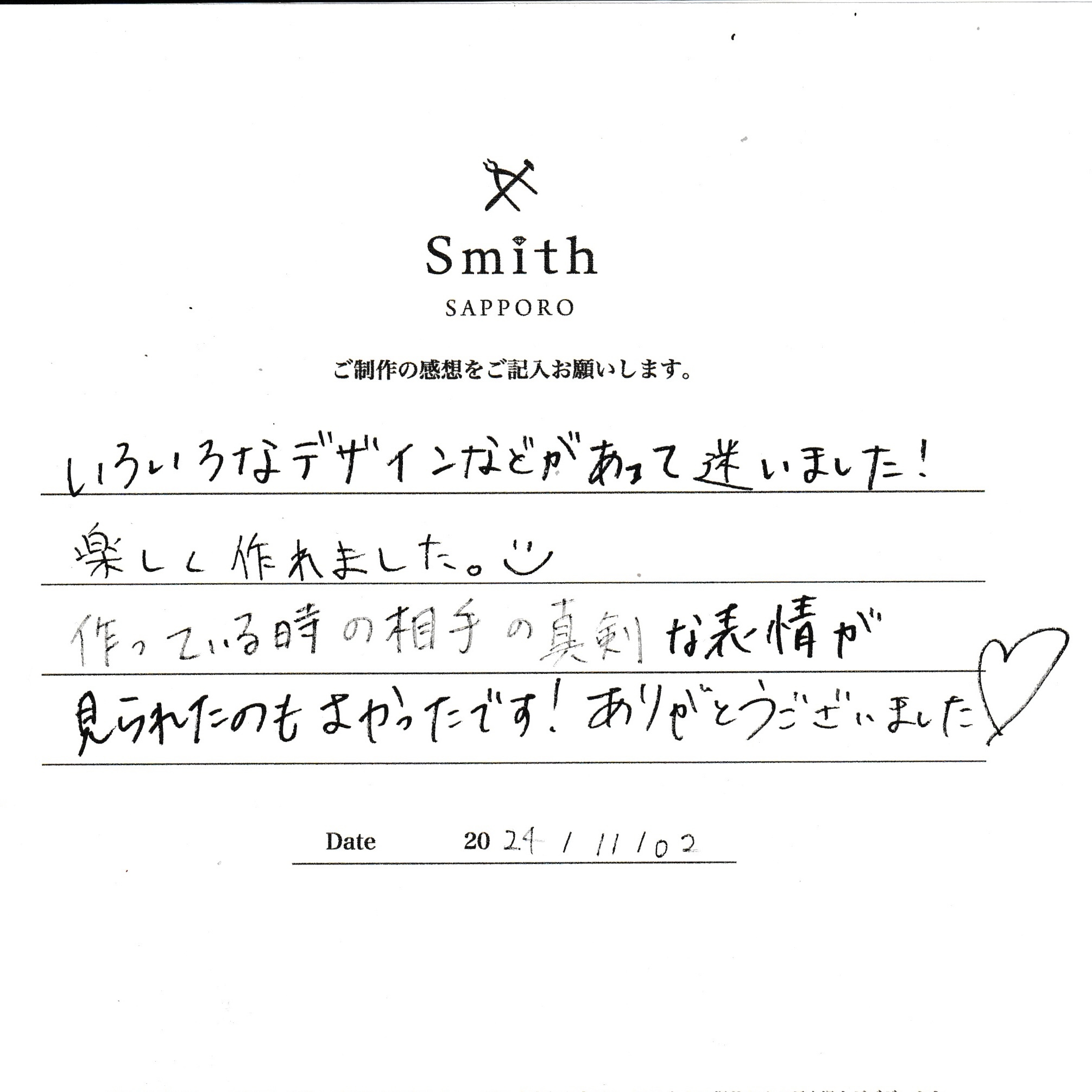 この度は、工房Smith京王プラザホテル札幌店で手作りペアリングのご制作誠にありがとうございました。