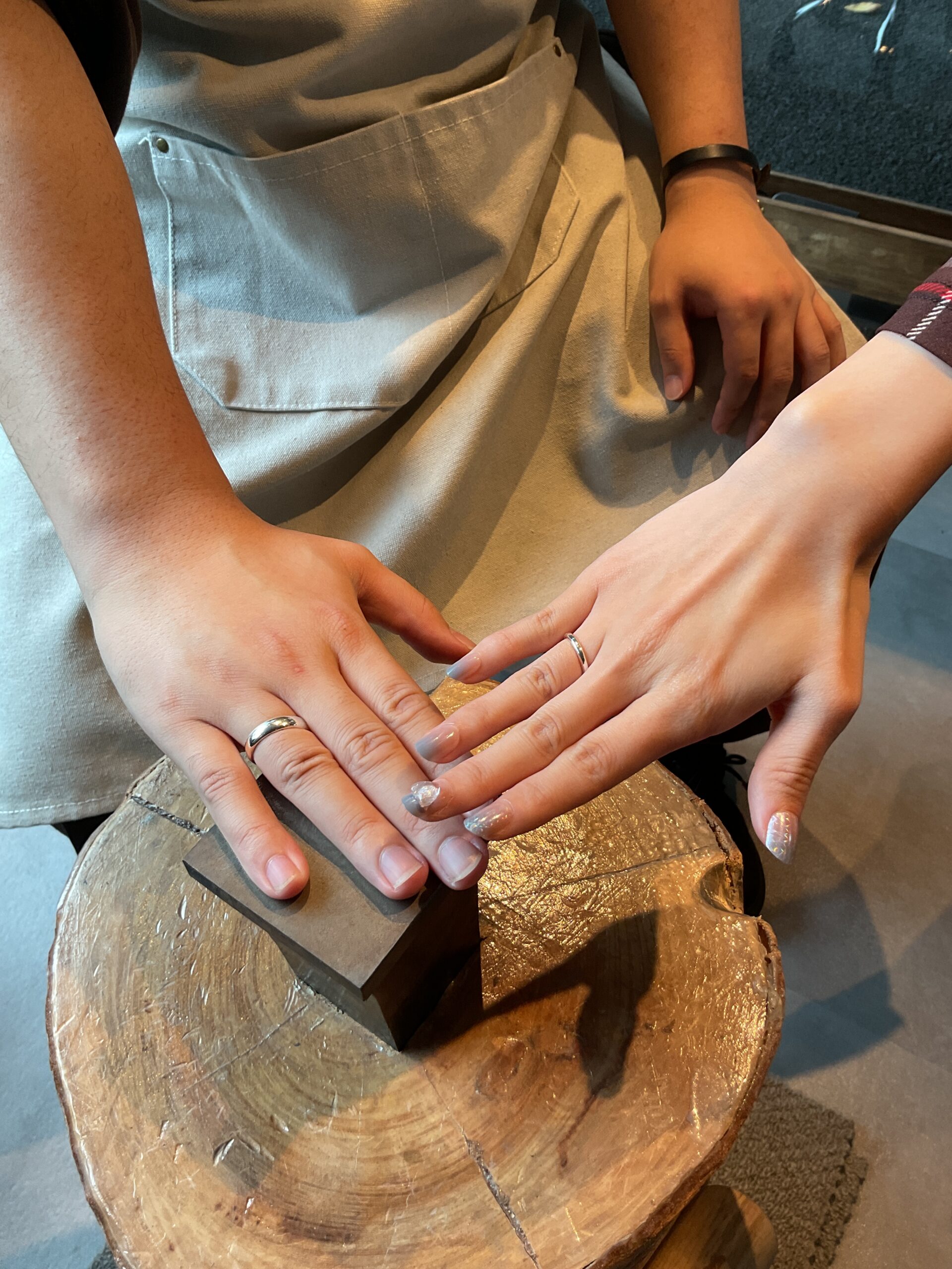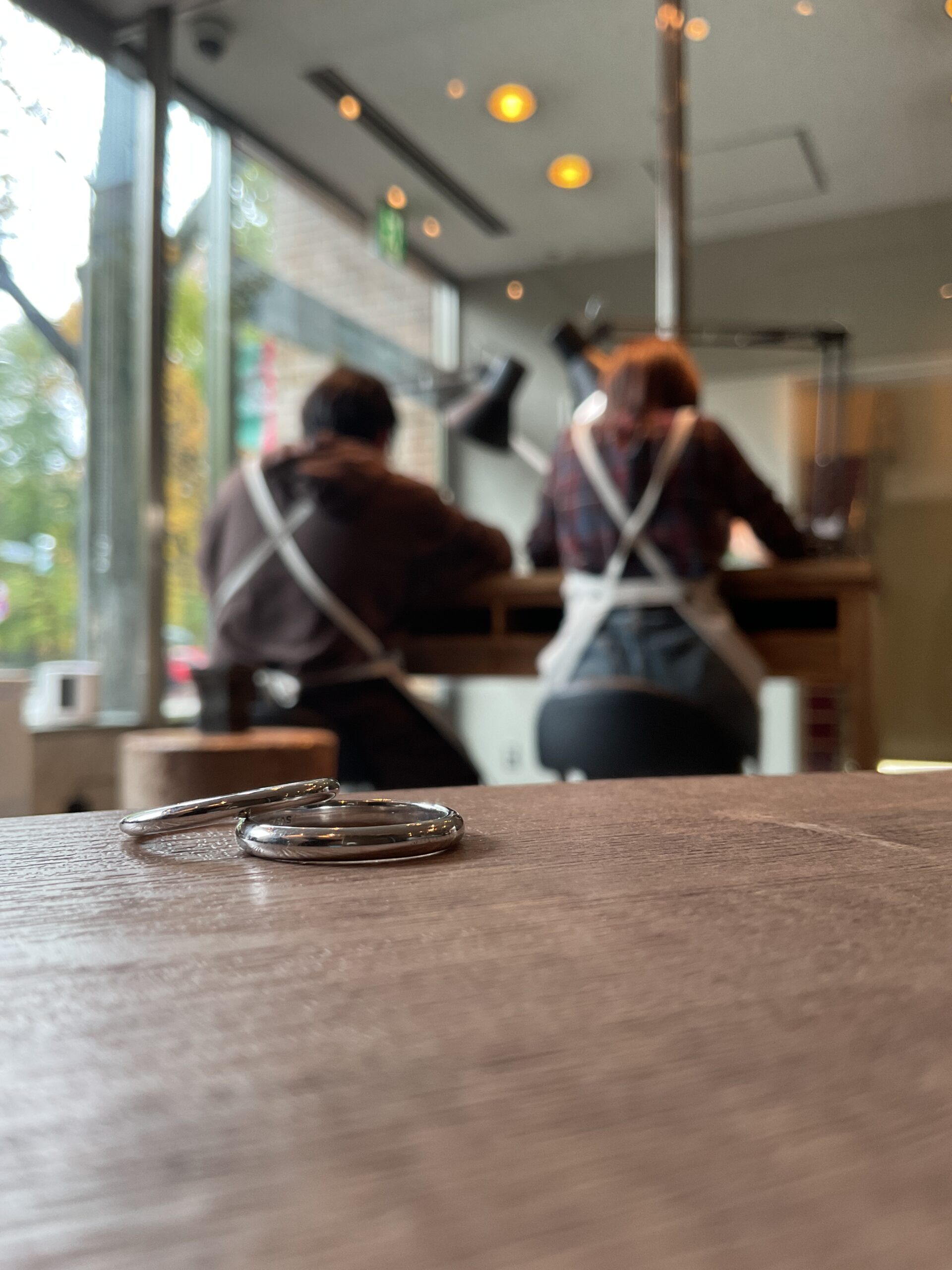 基本の形はおそろいの甲丸リングをお選びいただき、表面はピカピカになるまでたくさん磨いていただきました。