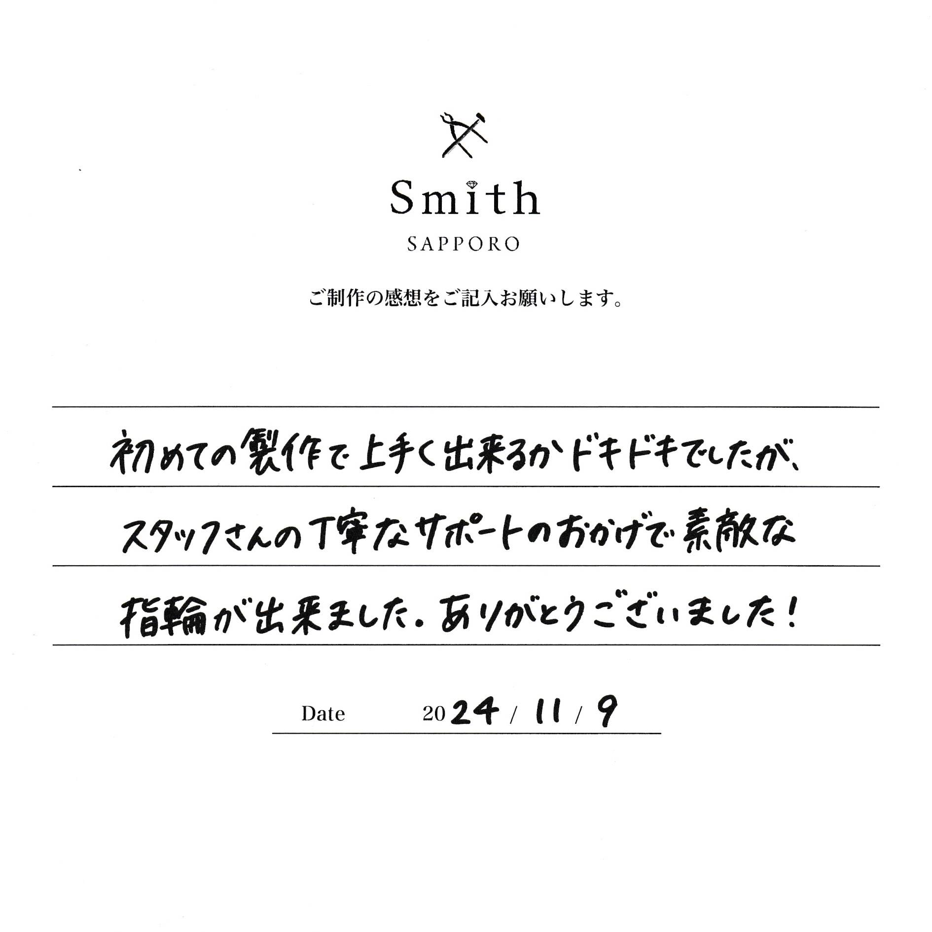 この度は、手作り婚約指輪のご制作に、工房スミス札幌店をお選び頂き、誠にありがとうございます。