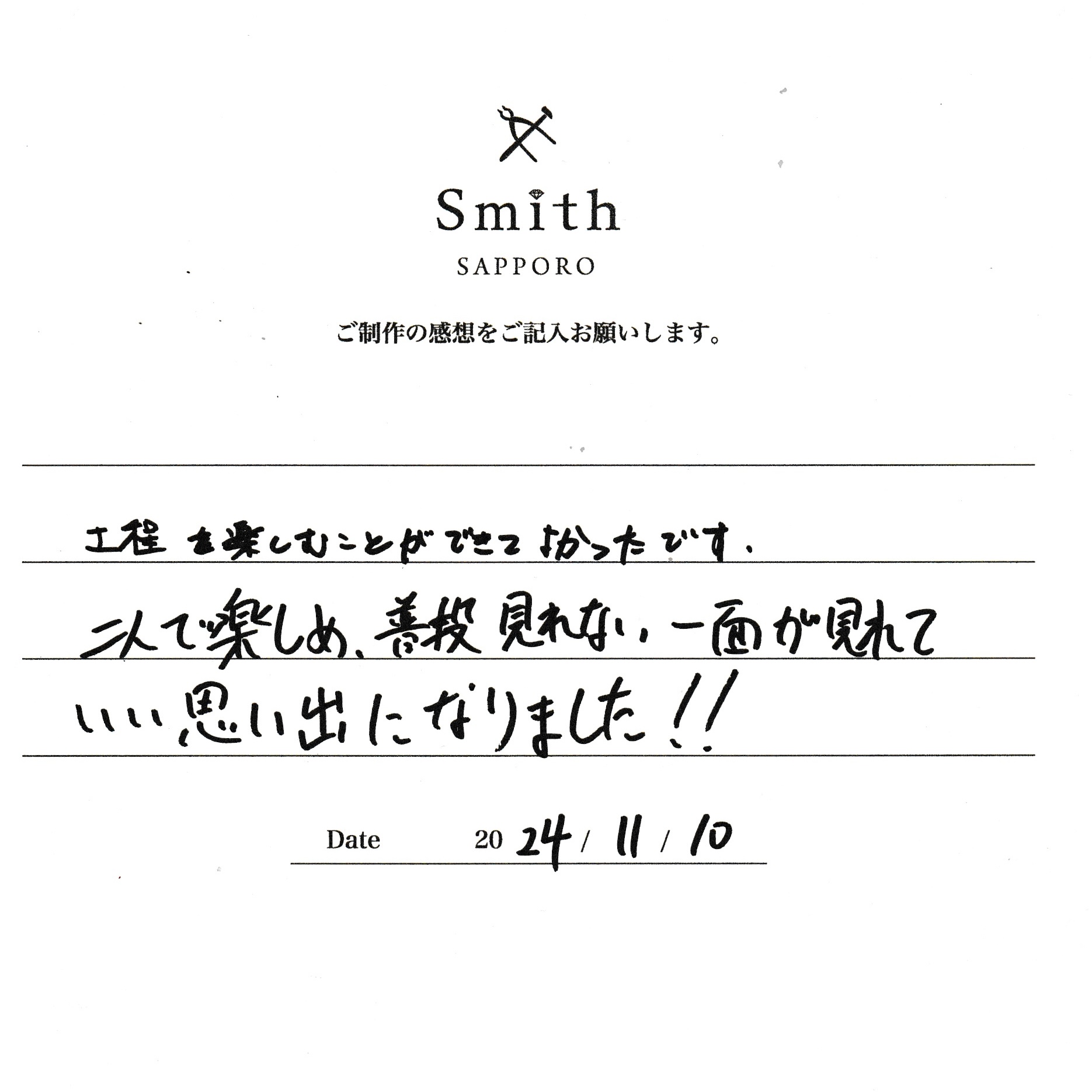 この度は、工房Smith京王プラザホテル札幌店で手作りペアリングのご制作誠にありがとうございました。