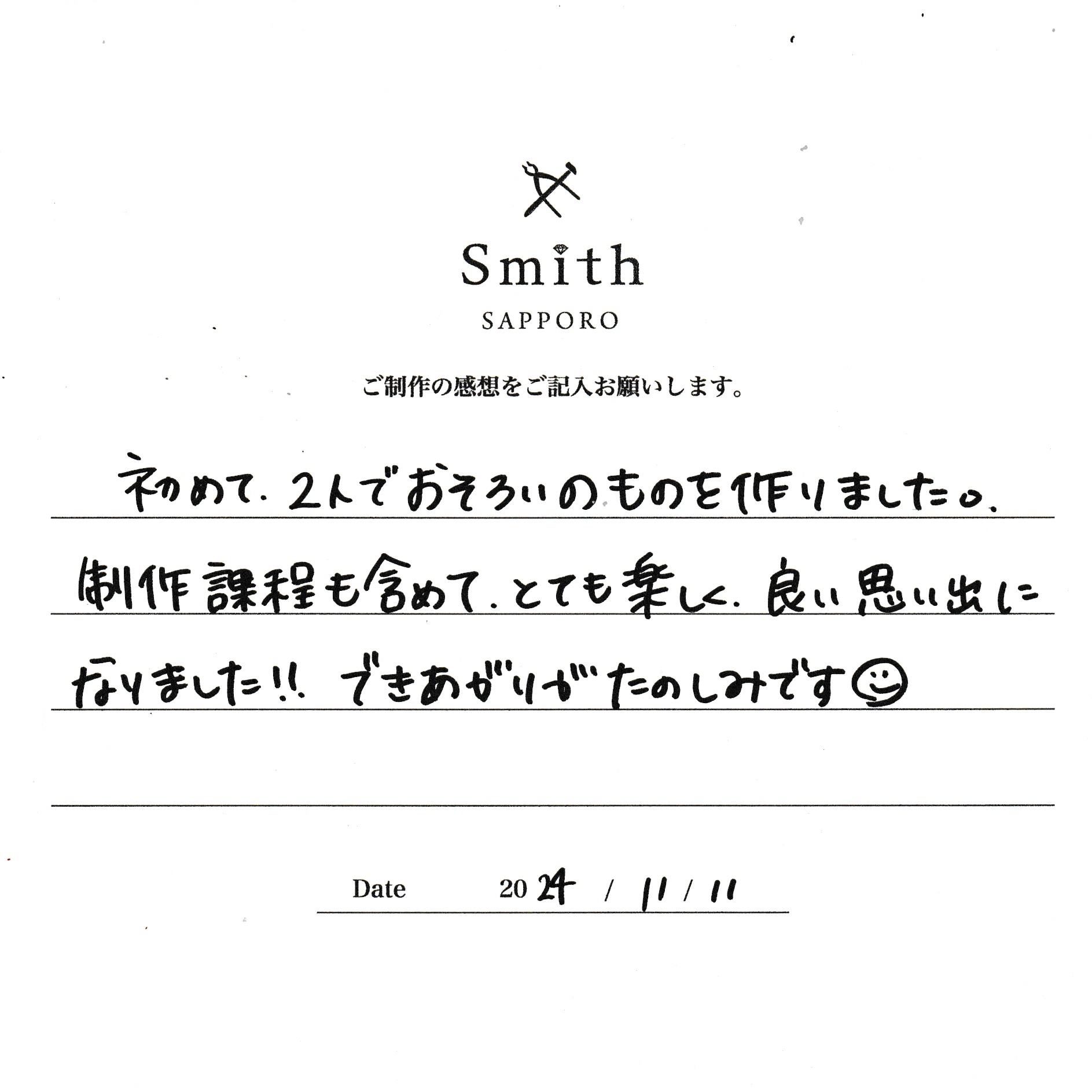 この度は、工房Smith京王プラザホテル札幌店で手作りペアリングのご制作誠にありがとうございました。