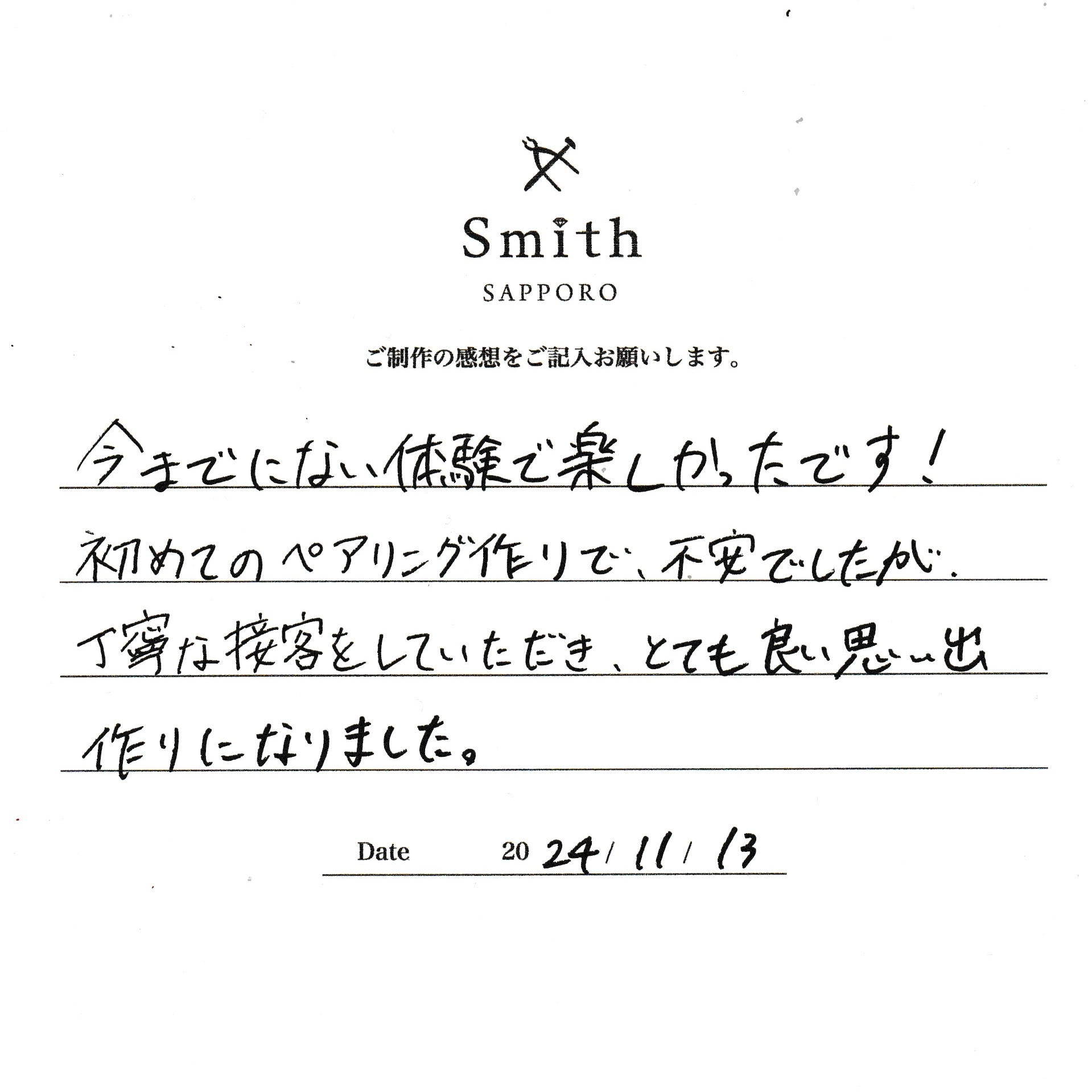 この度は、工房Smith京王プラザホテル札幌店で手作りペアリングのご制作誠にありがとうございました。