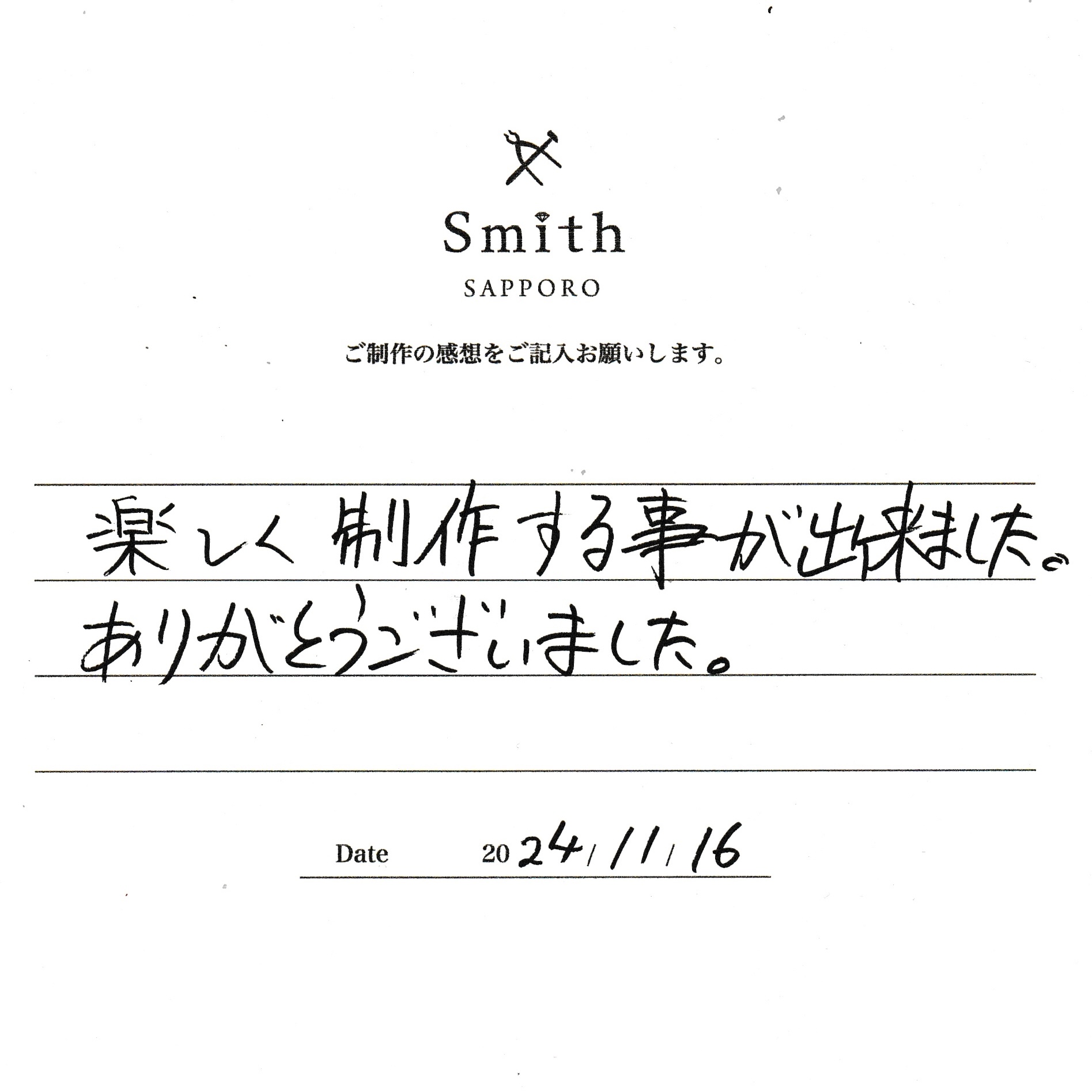 この度は、工房Smith京王プラザホテル札幌店で手作りペアリングのご制作誠にありがとうございました。