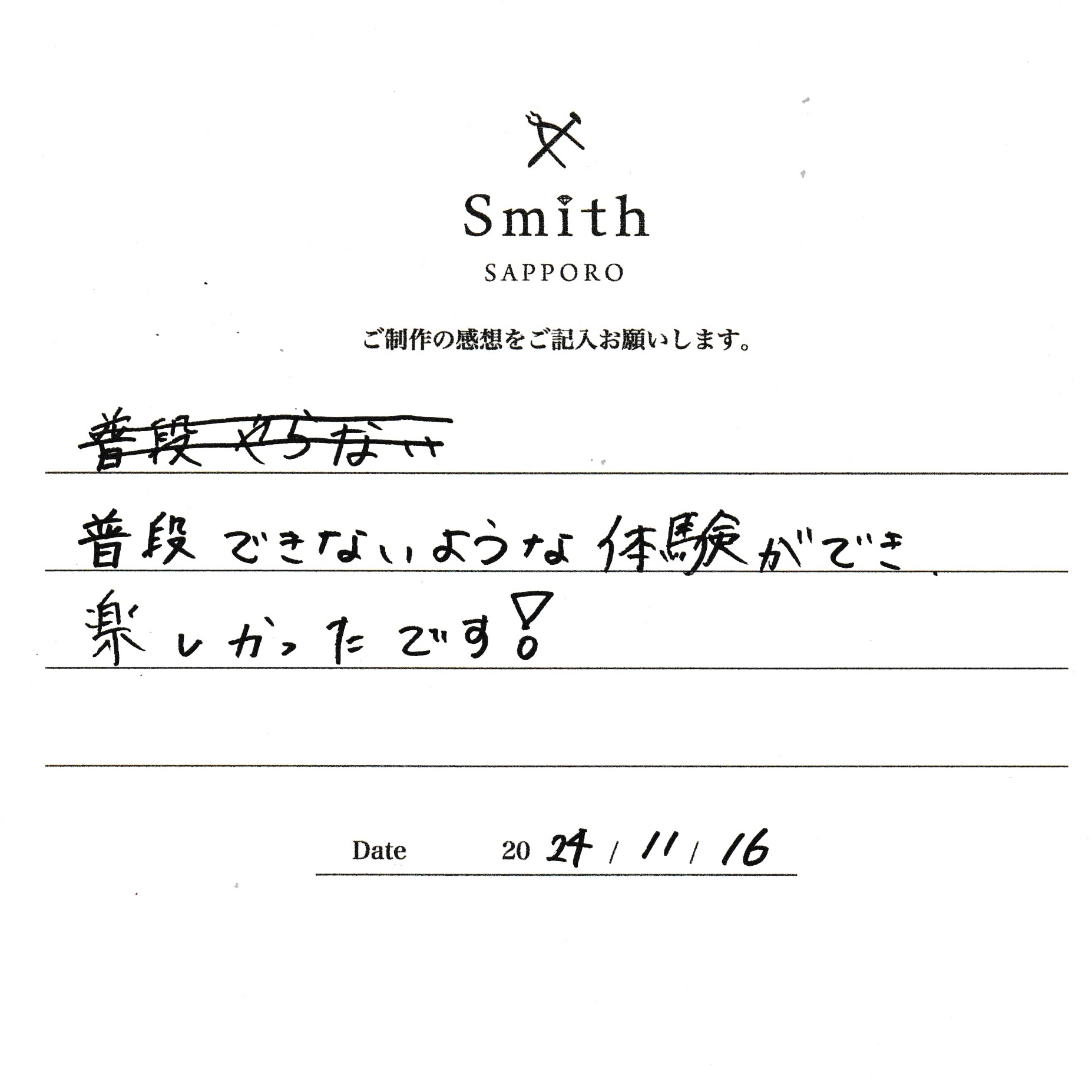 この度は、工房Smith京王プラザホテル札幌店で手作りペアリングのご制作誠にありがとうございました。