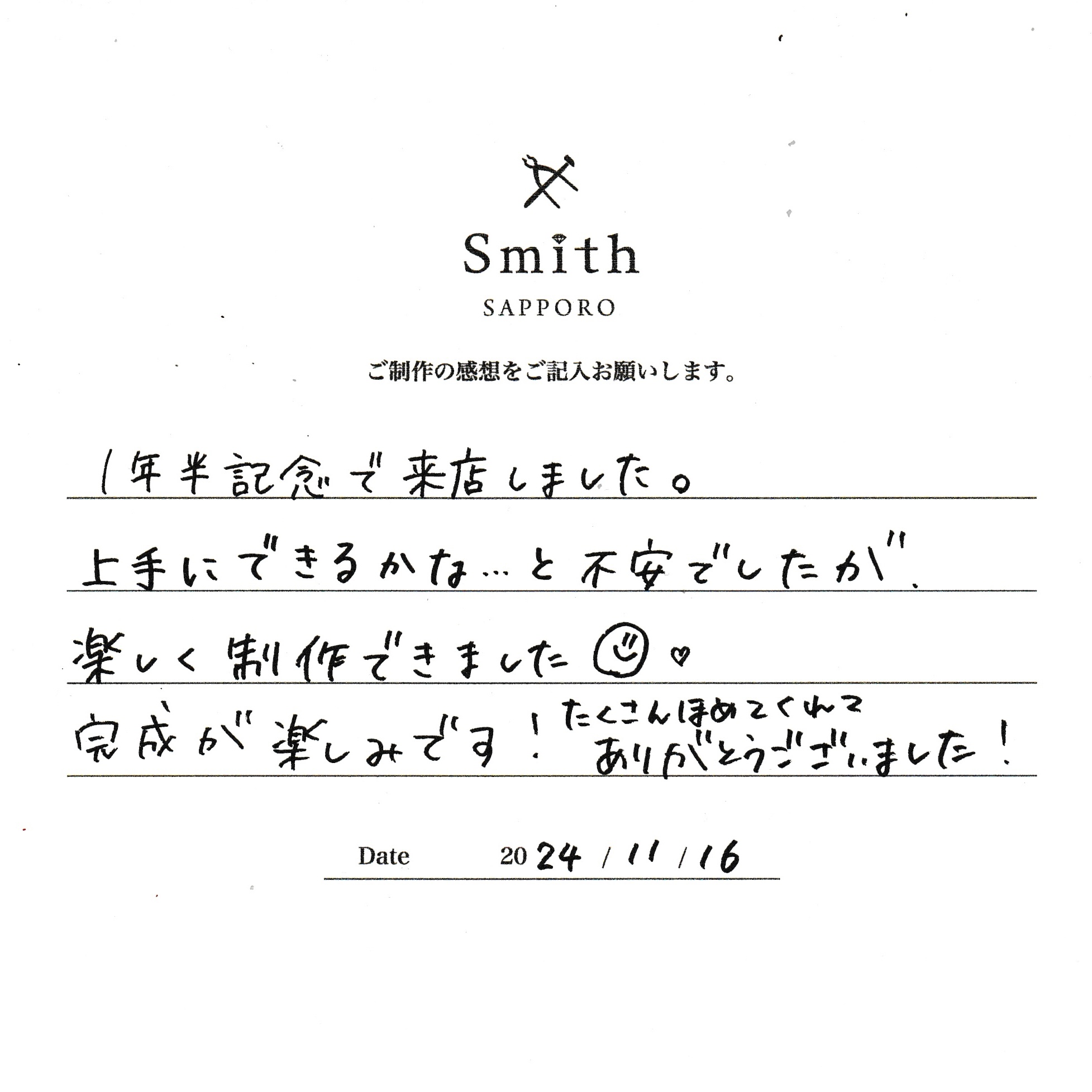 この度は、工房Smith京王プラザホテル札幌店で手作りペアリングのご制作誠にありがとうございました。
