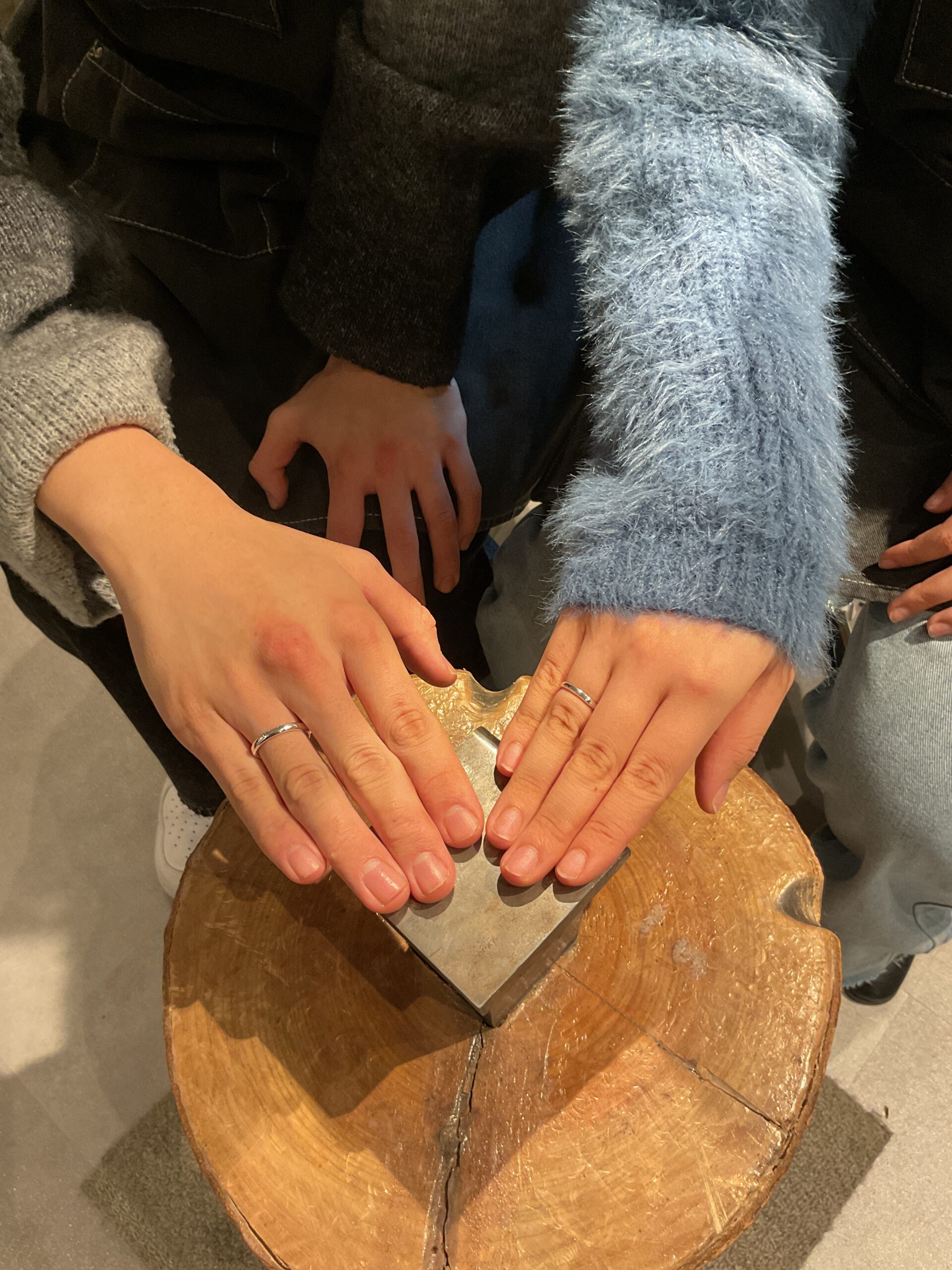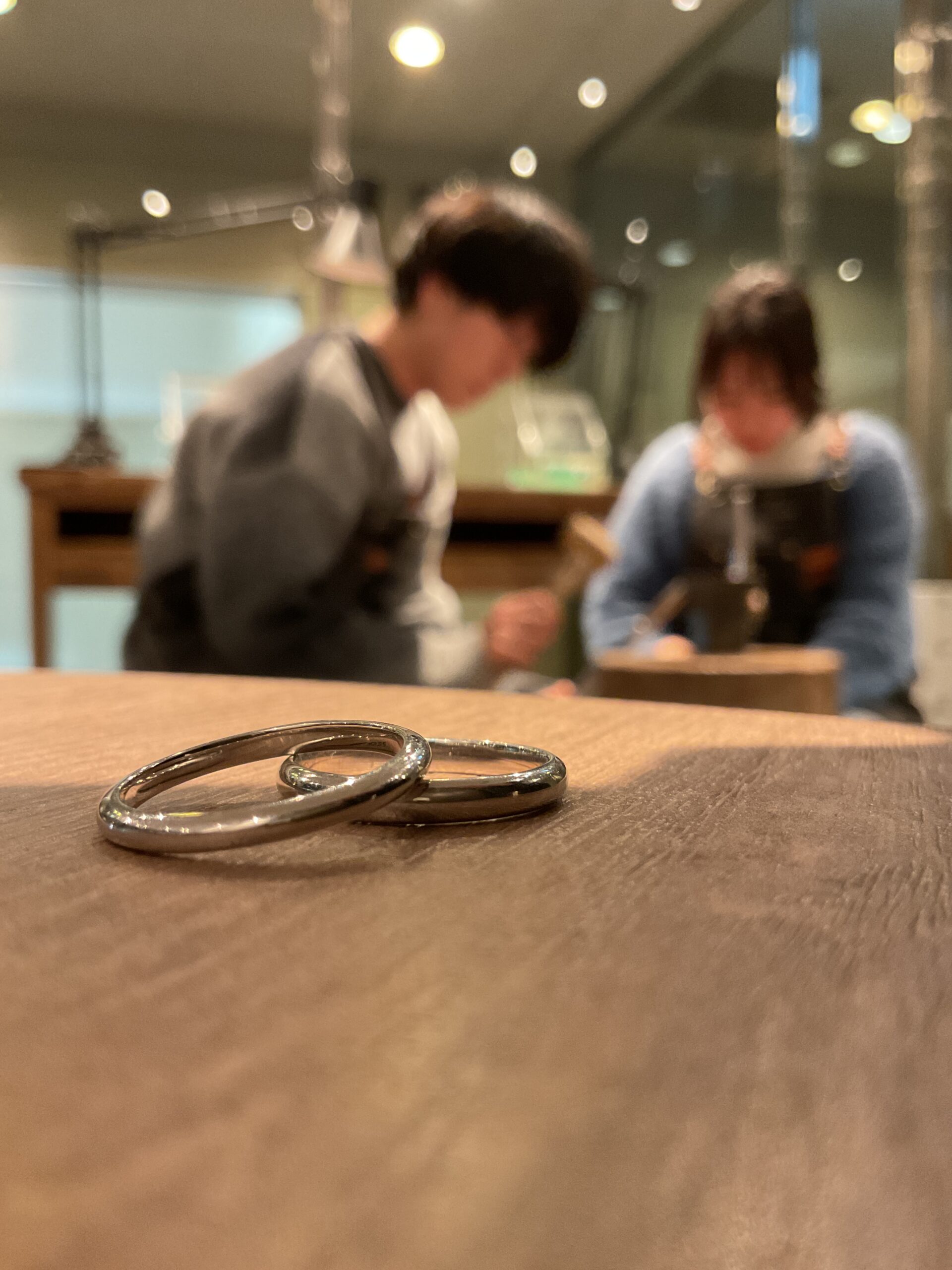 基本の形は2mmと3mmの甲丸リングにテクスチャーは鏡面をお選びいただき、ピカピカになるまで磨いていただきました。