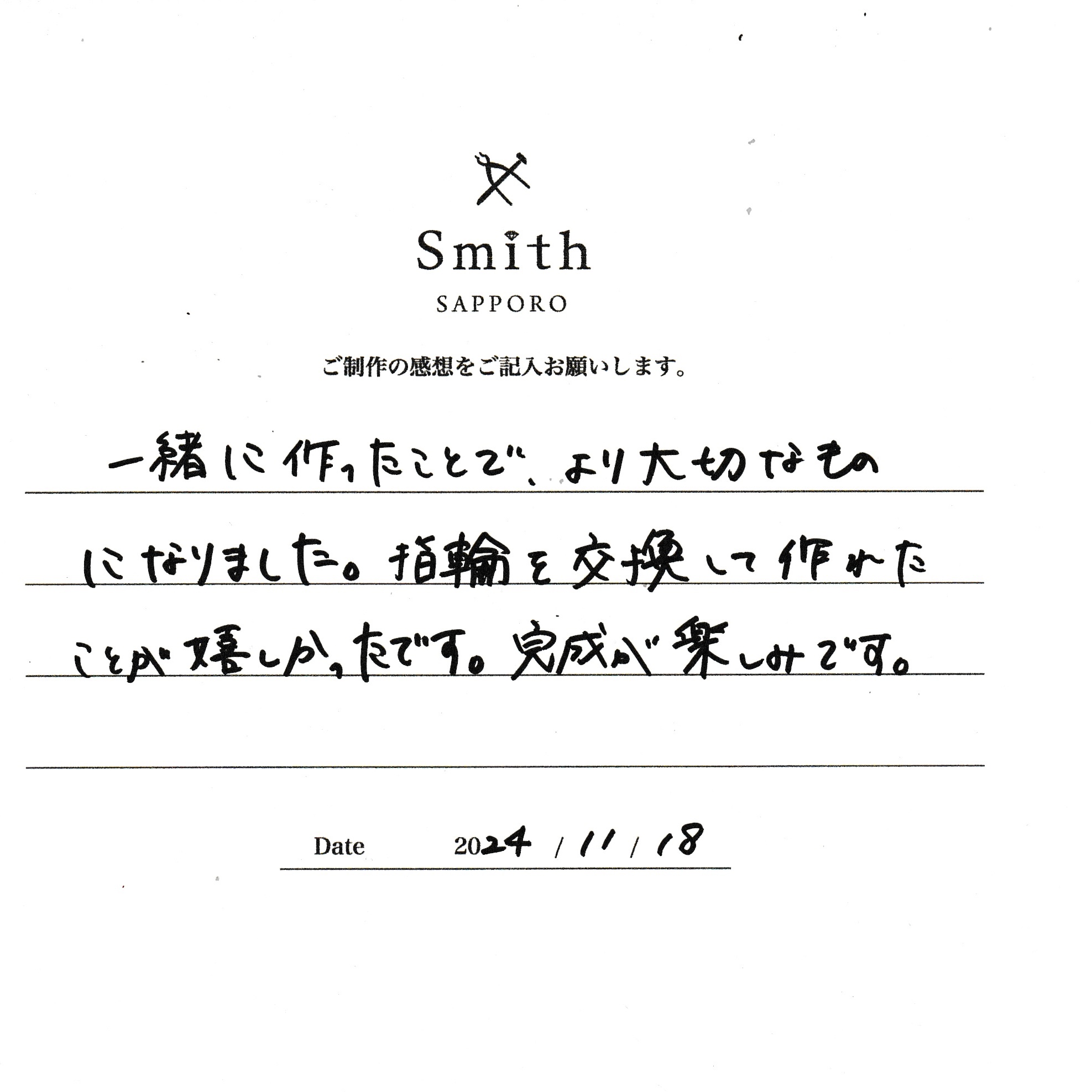 この度は、工房Smith京王プラザホテル札幌店で手作りペアリングのご制作誠にありがとうございました。