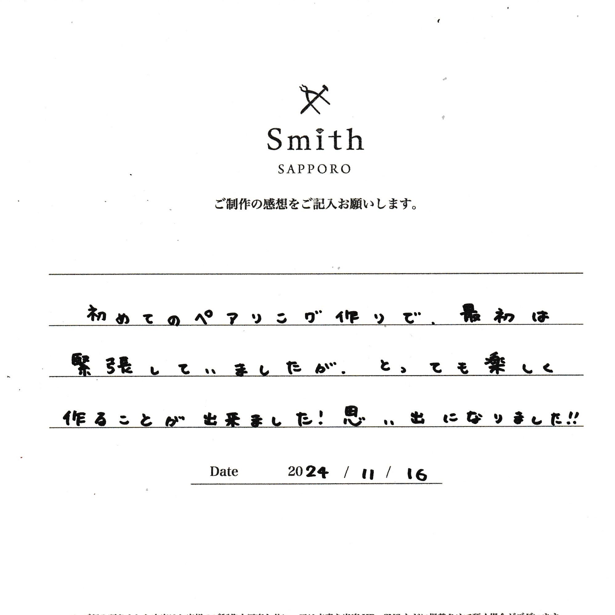 この度は、工房Smith京王プラザホテル札幌店で手作りペアリングのご制作誠にありがとうございました。