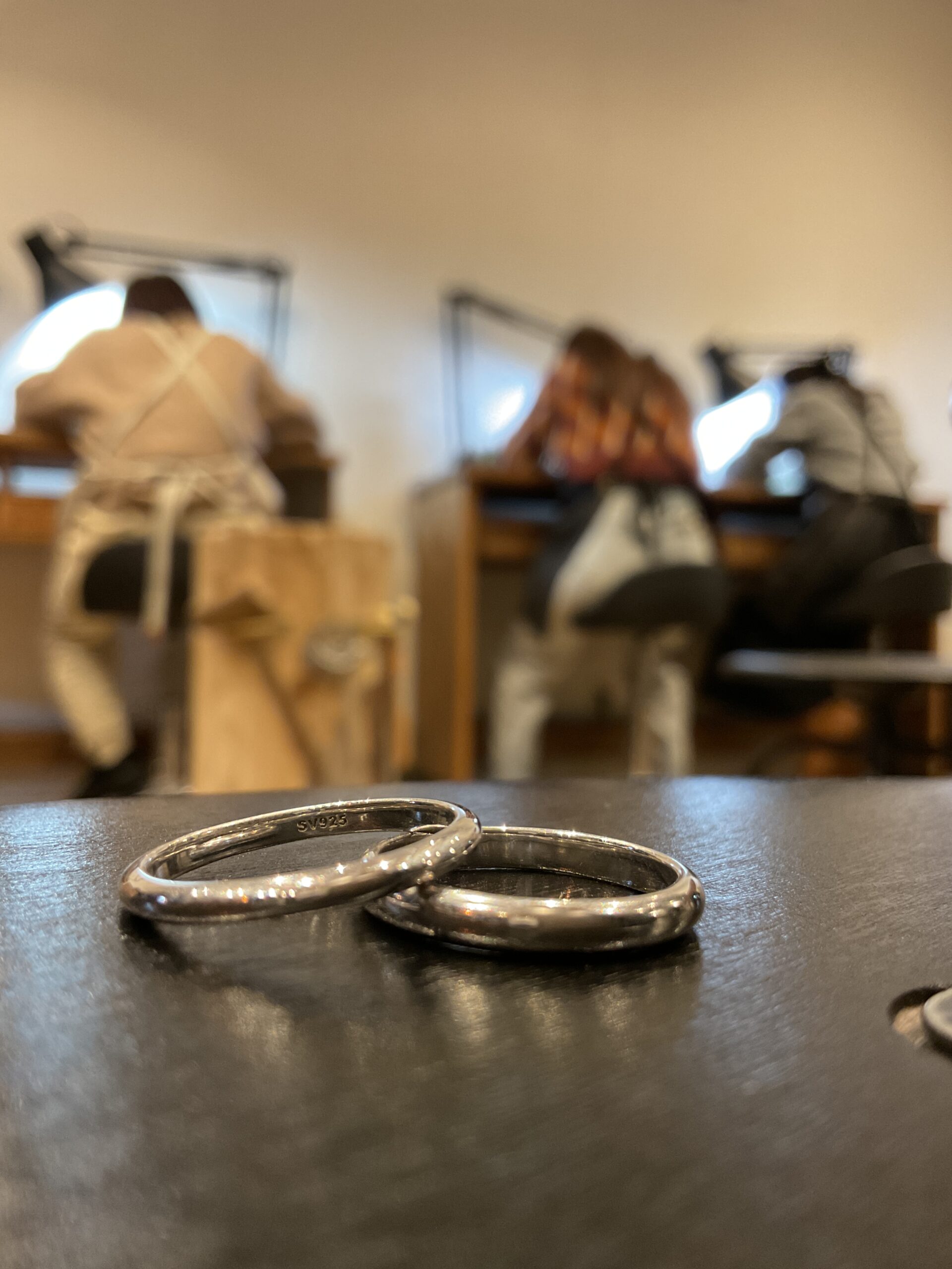 基本の形は3mmの甲丸リングにテクスチャーは鏡面とハンマーをお選びいただきました。