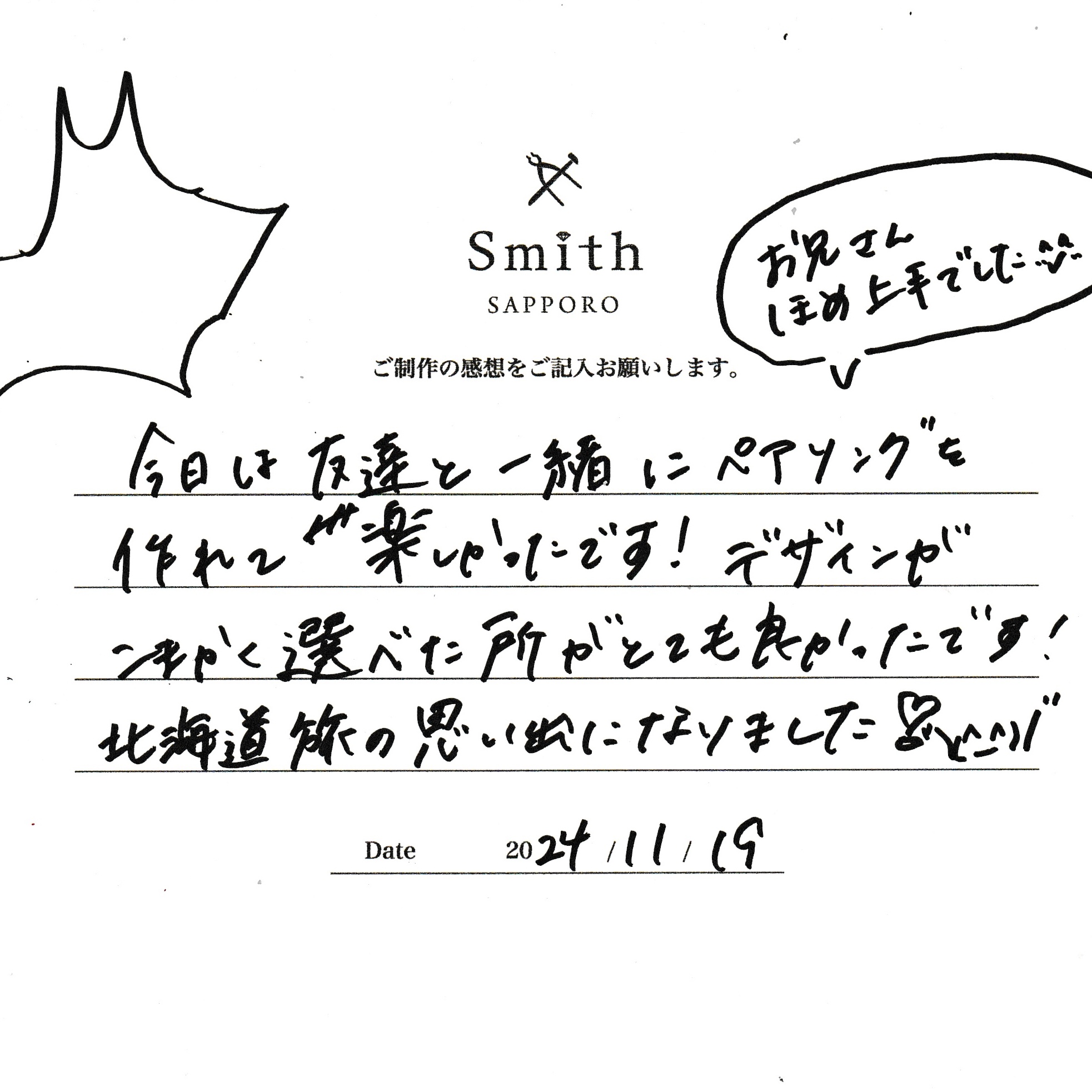 この度は、工房Smith京王プラザホテル札幌店で手作りペアリングのご制作誠にありがとうございました。