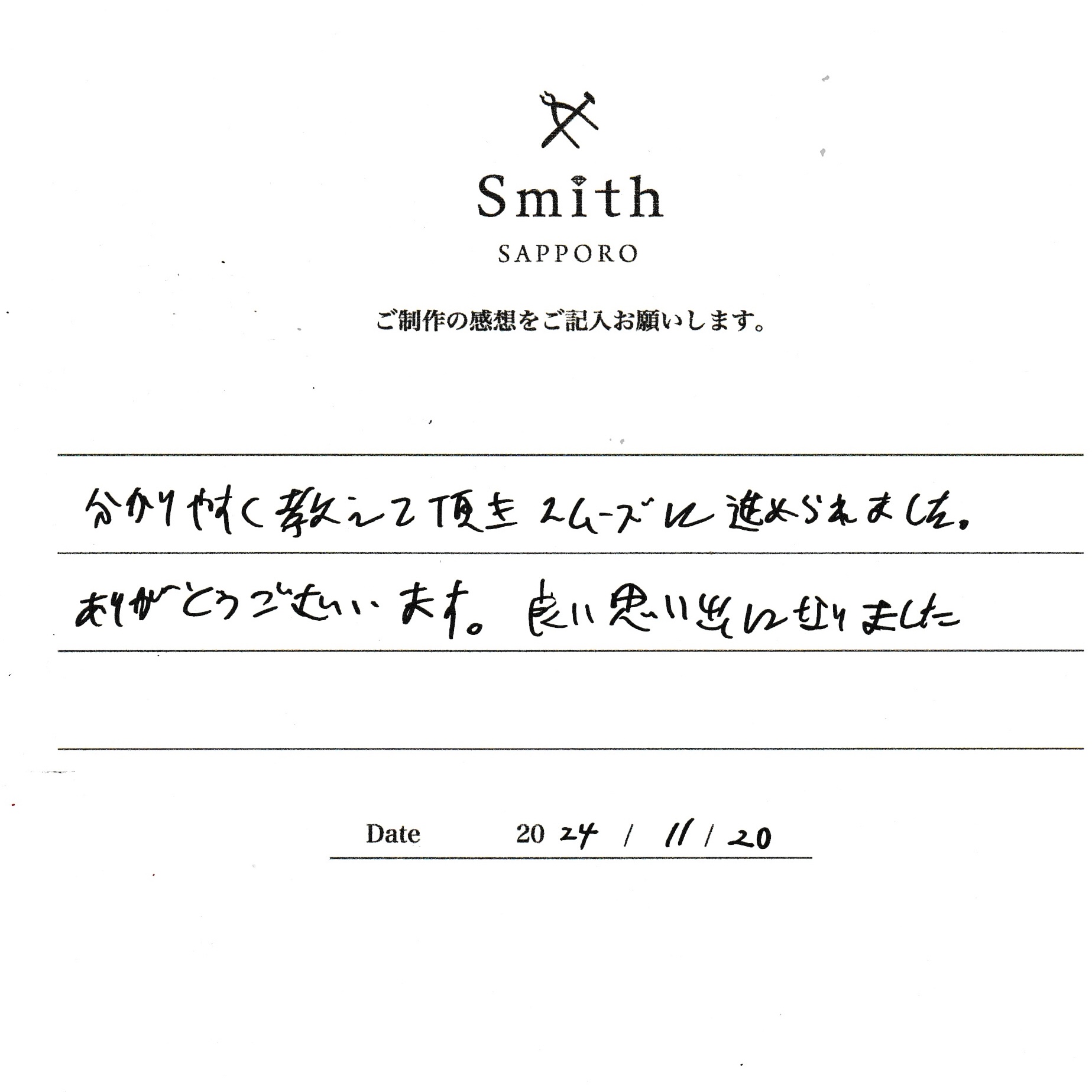 この度は、工房Smith京王プラザホテル札幌店で手作りペアリングのご制作誠にありがとうございました。