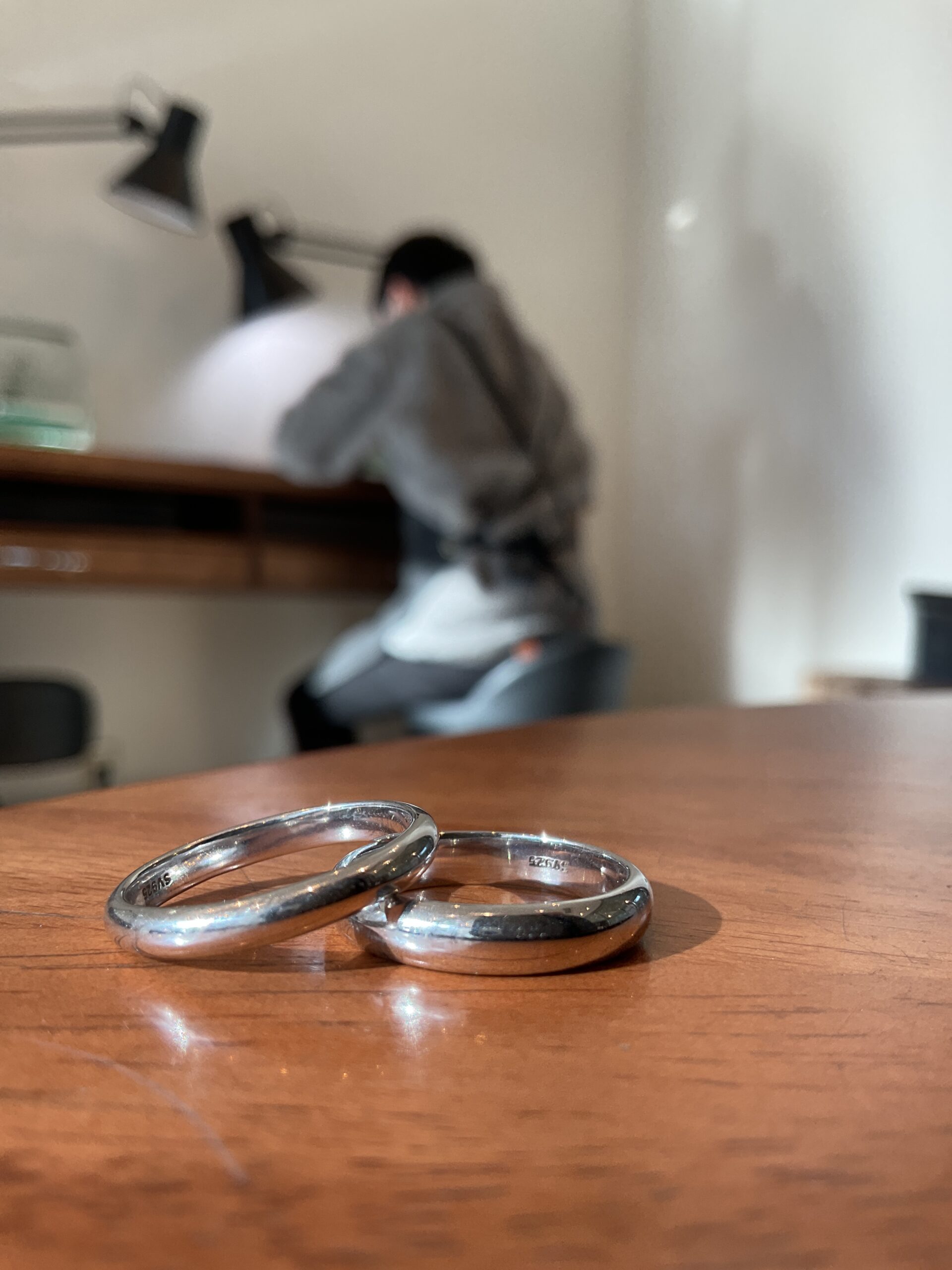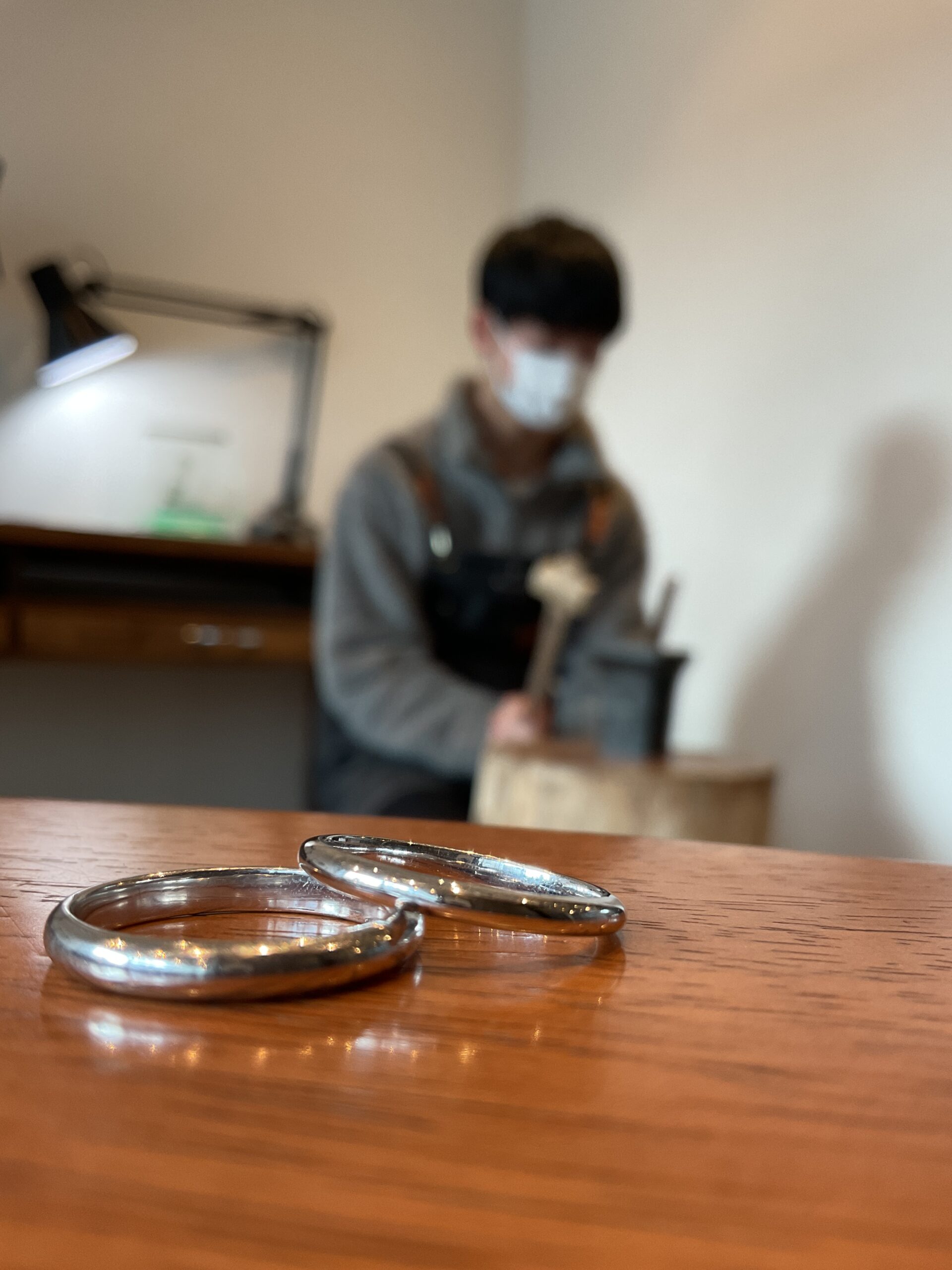 基本の形は2mmの甲丸リングにテクスチャーは鏡面をお選びいただき、ピカピカになるまで磨いていただきました。