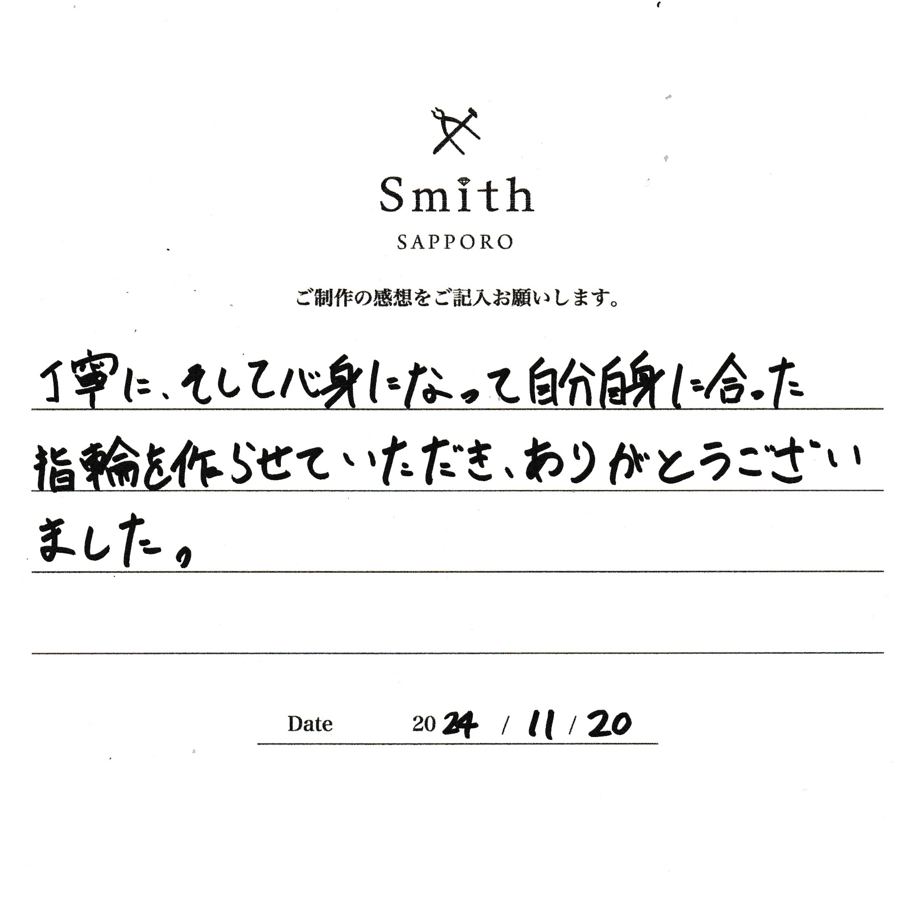 この度は、工房Smith京王プラザホテル札幌店で手作りペアリングのご制作誠にありがとうございました。