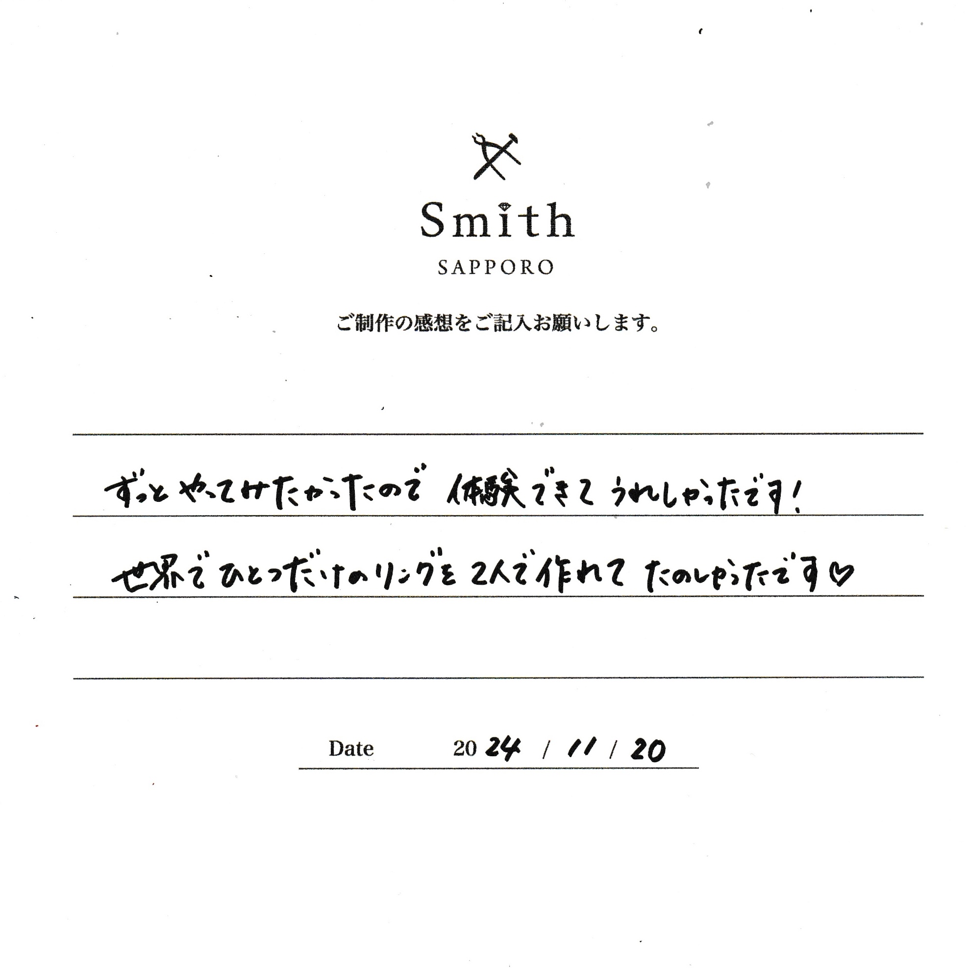 この度は、工房Smith京王プラザホテル札幌店で手作りペアリングのご制作誠にありがとうございました。