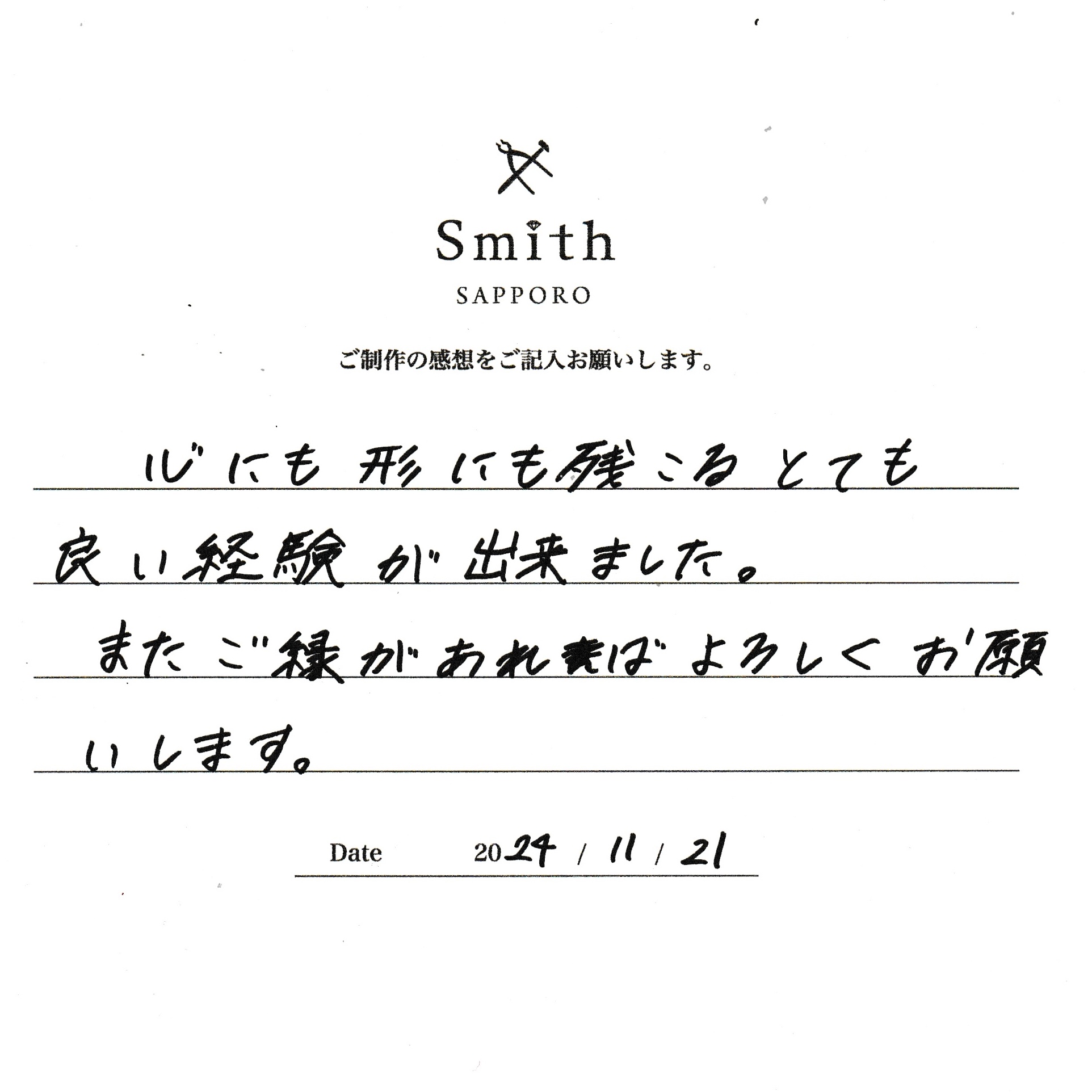 この度は、工房Smith京王プラザホテル札幌店で手作りペアリングのご制作誠にありがとうございました。