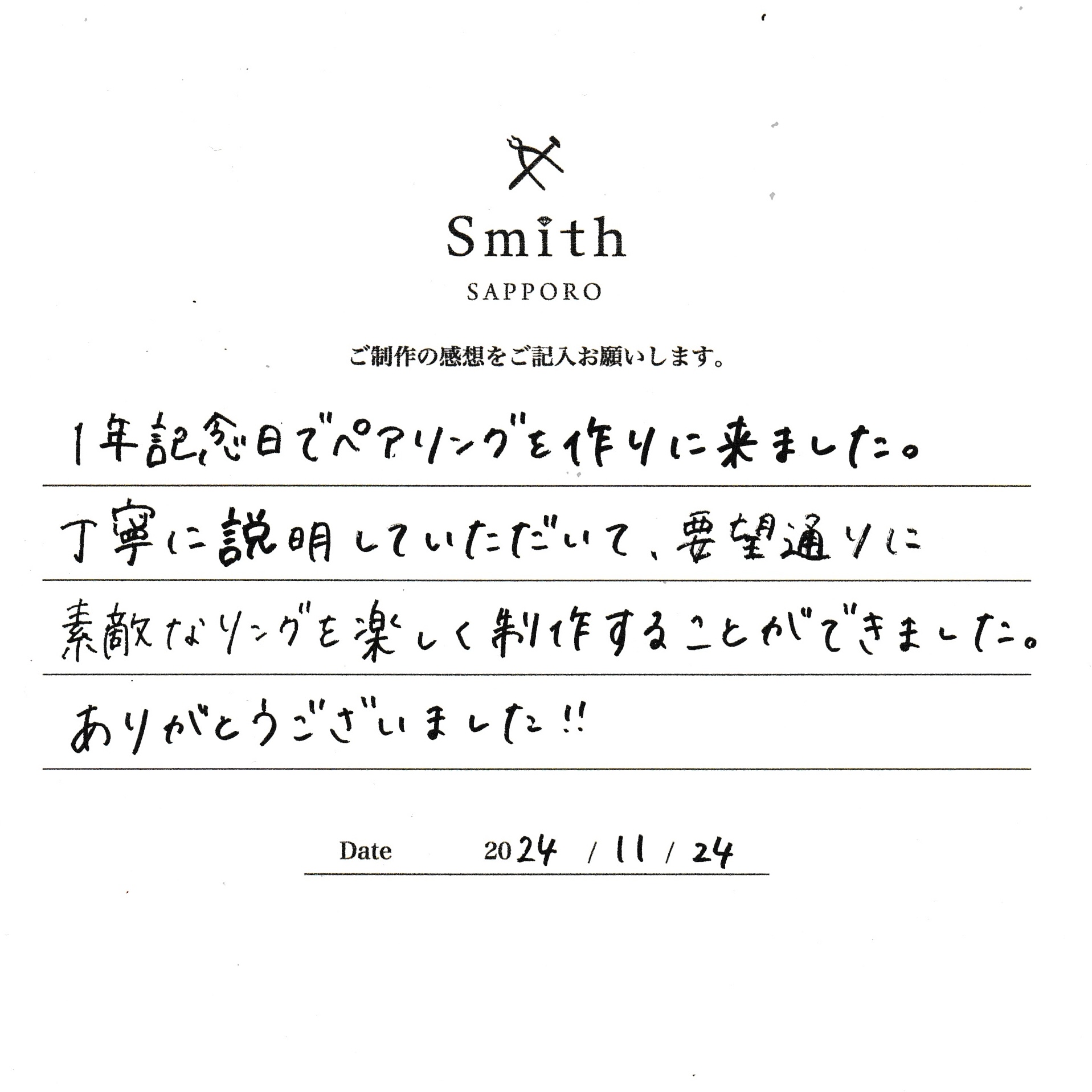 この度は、工房Smith京王プラザホテル札幌店で手作りペアリングのご制作誠にありがとうございました。