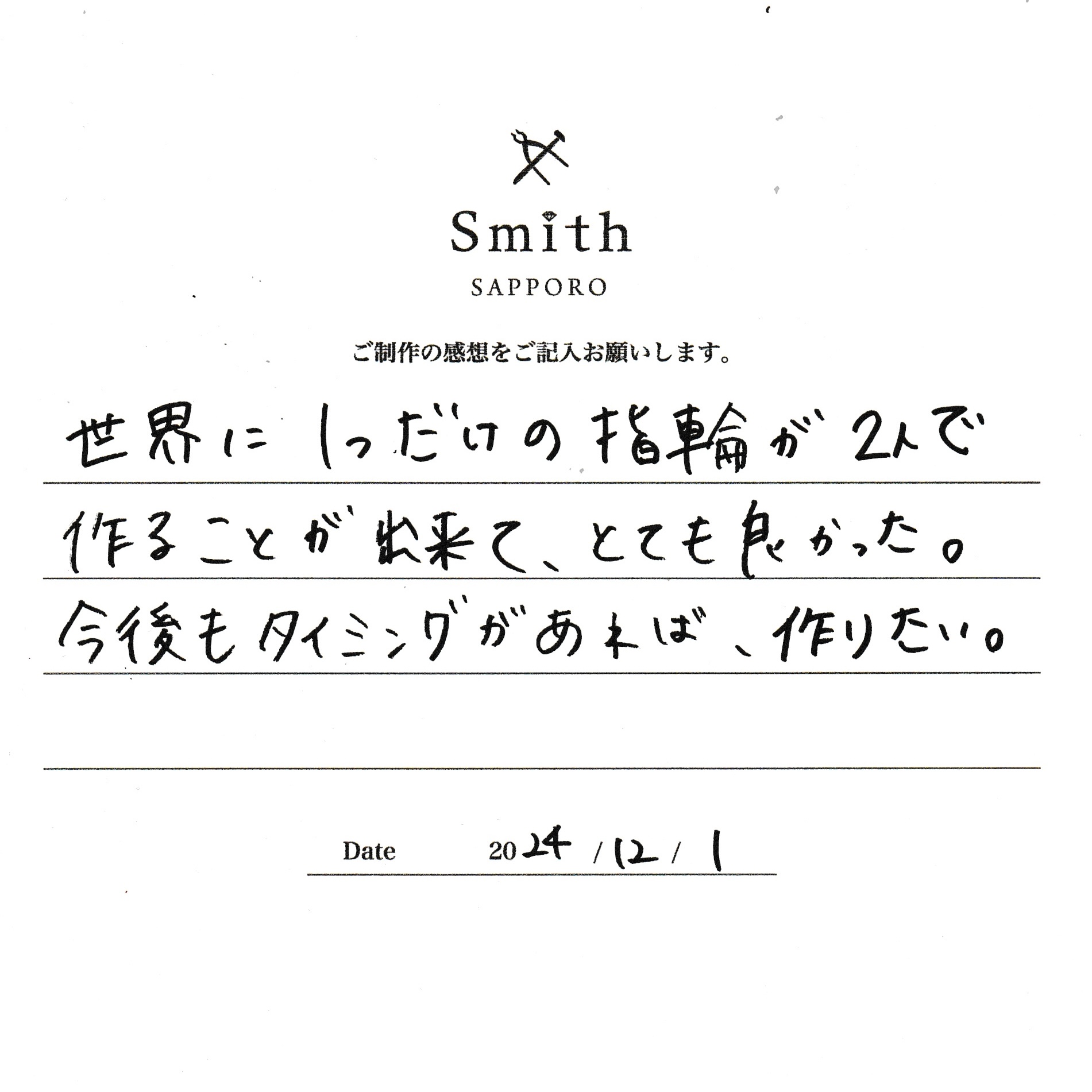 世界に一つだけの指輪が2人で作ることが出来て、とても良かった。