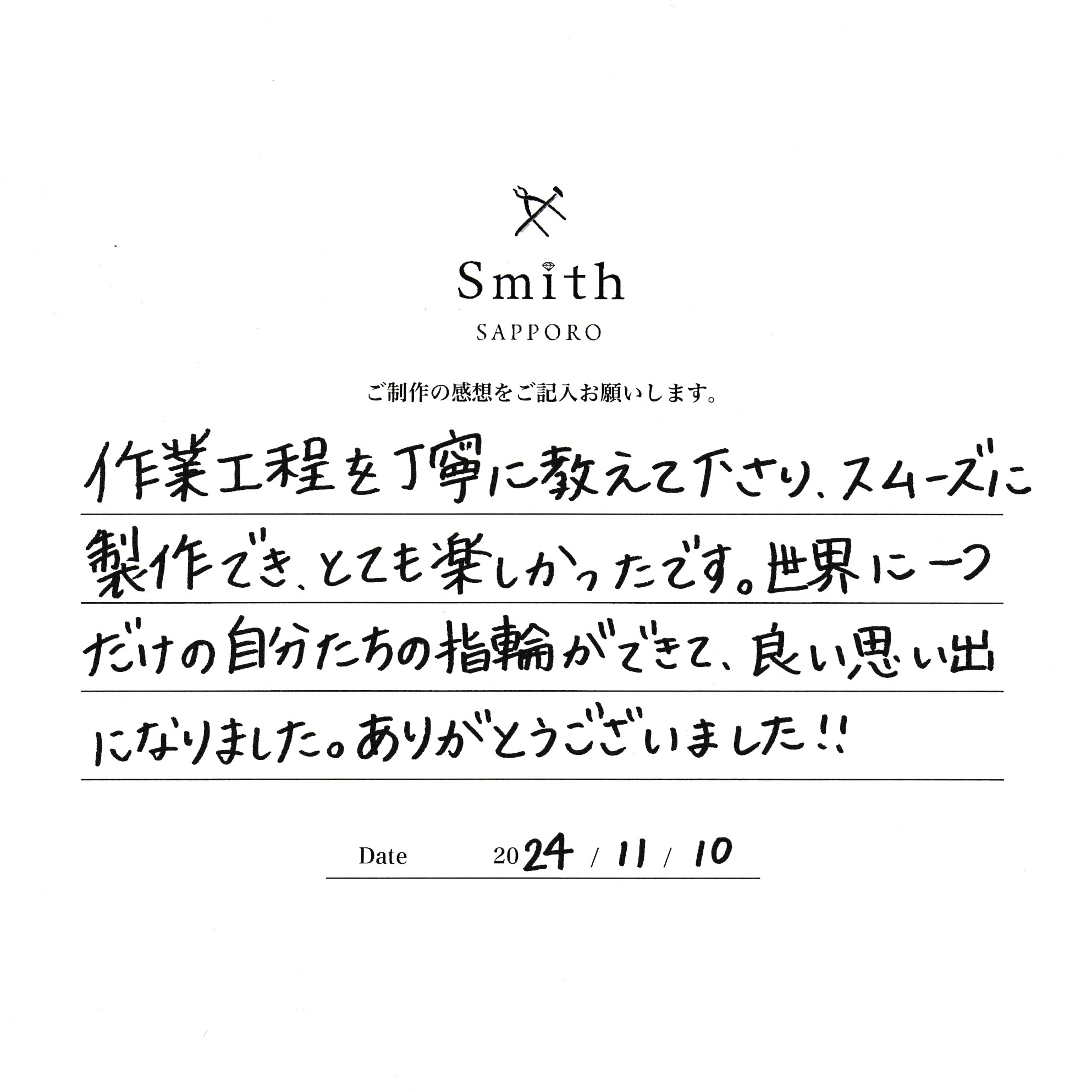 一つ一つの工程で指輪の形になっていく様子に喜んでいただき、サポートに入らせていただいたスタッフとしてとても嬉しく思います。