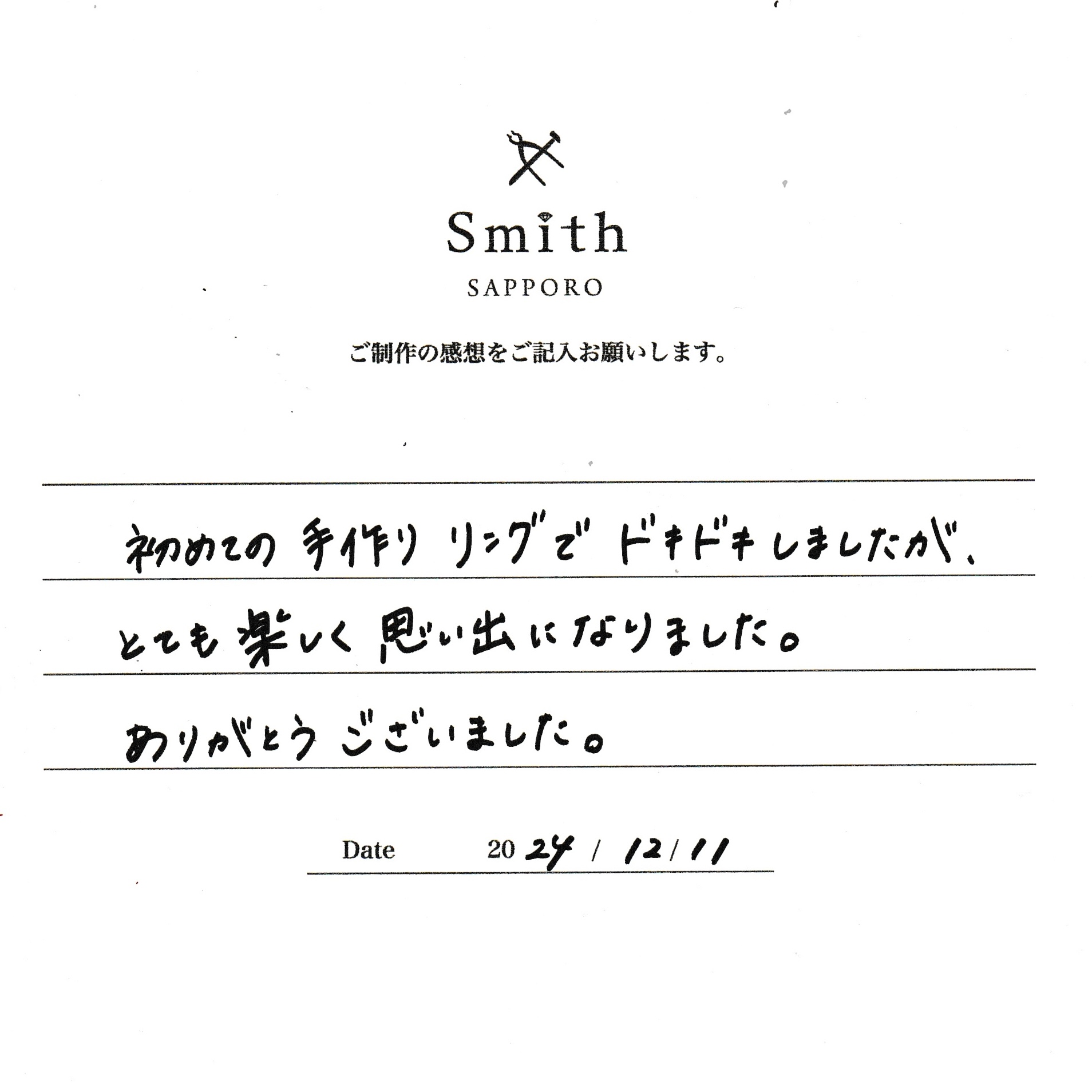 この度は、工房Smith京王プラザホテル札幌店で手作りペアリングのご制作誠にありがとうございました。