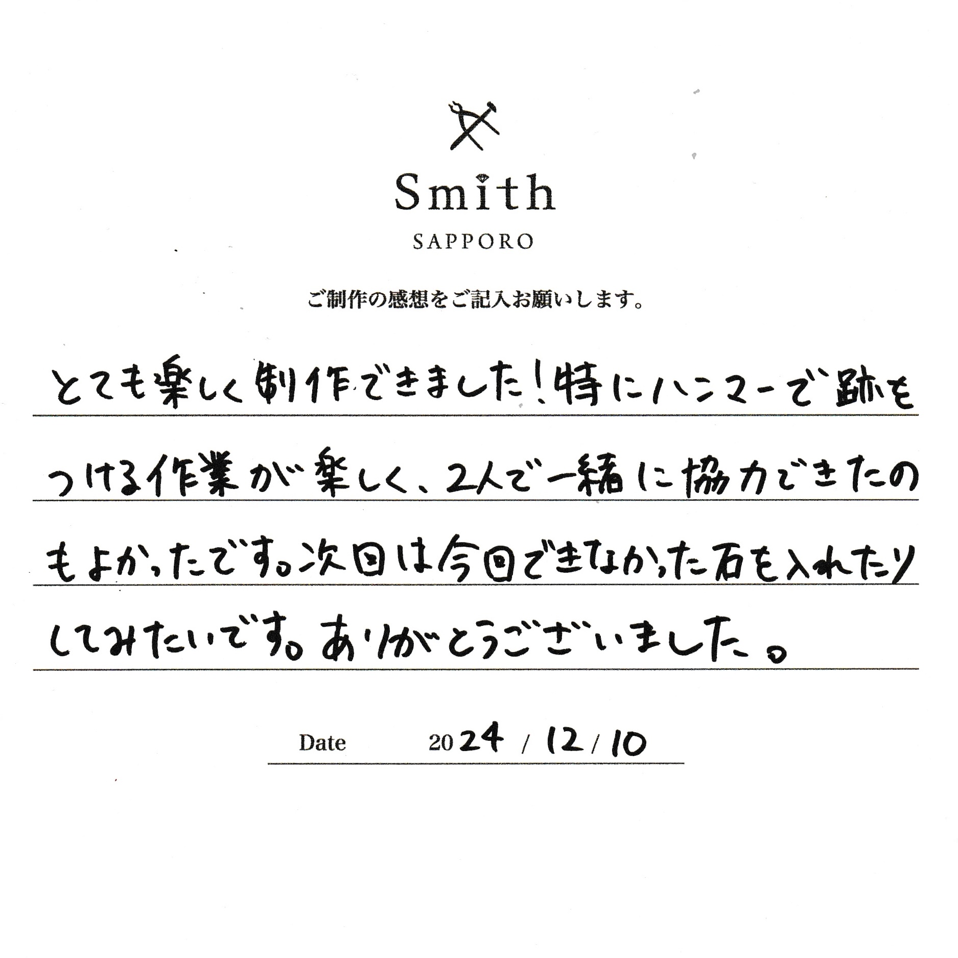 特にハンマーで跡をつける作業が楽しく、2人で一緒に協力できたのも良かったです。