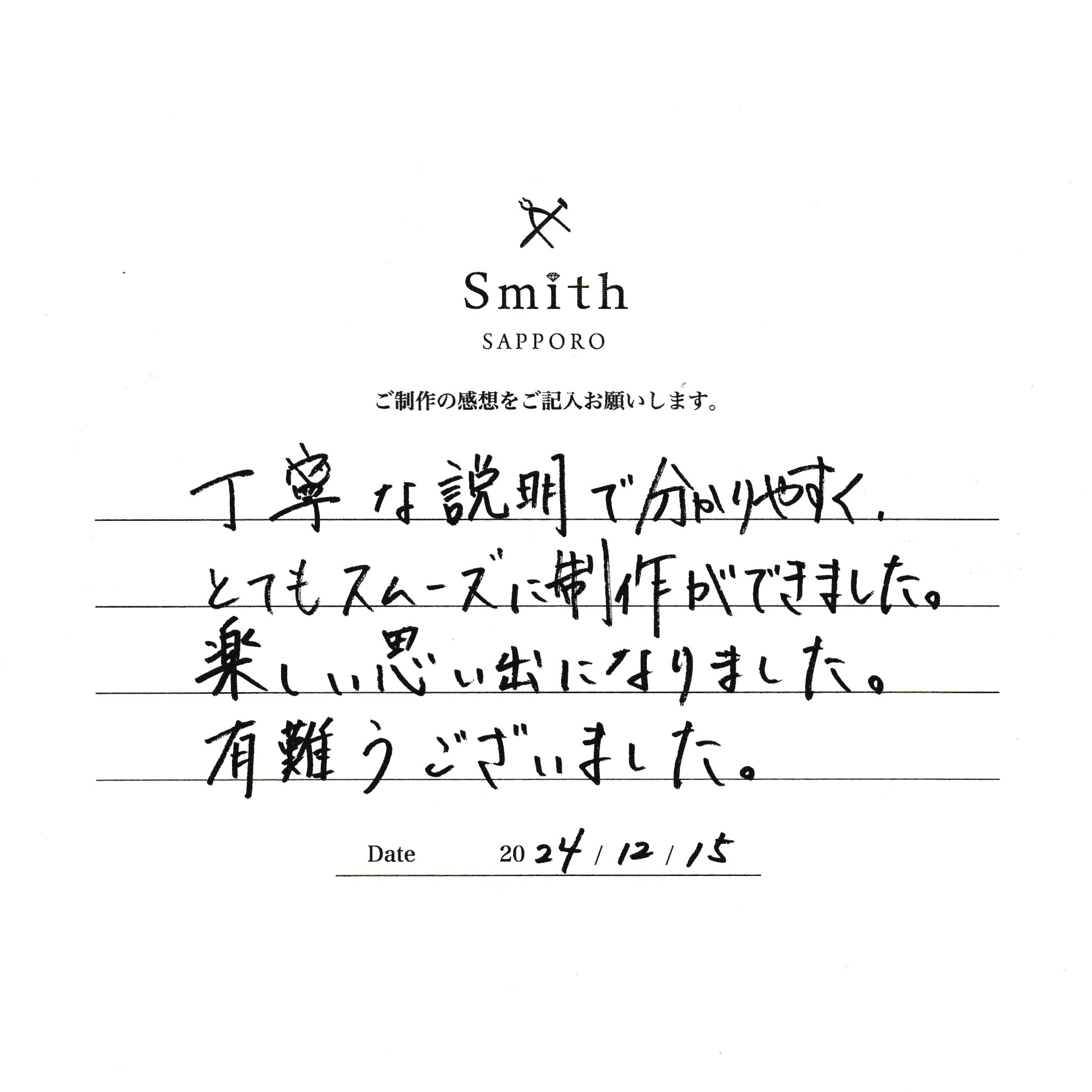 この度は手作り結婚指輪のご制作に、工房スミス札幌本店へお越しいただきまして誠にありがとうございます。