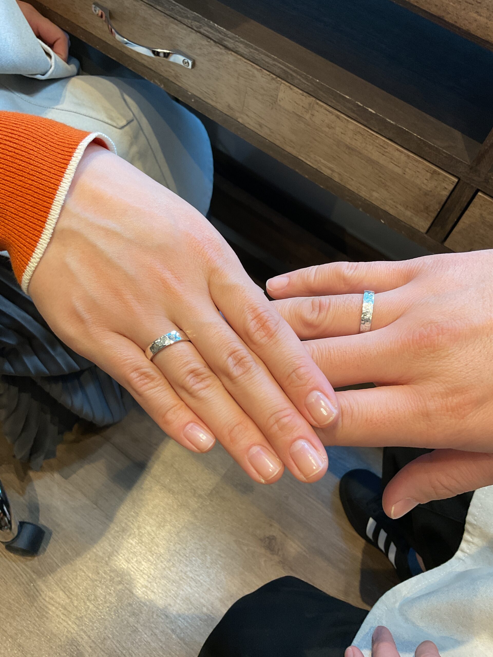 基本の形は4mmの平打ちリングにテクスチャーは鏡面とハンマーをお選びいただきました。