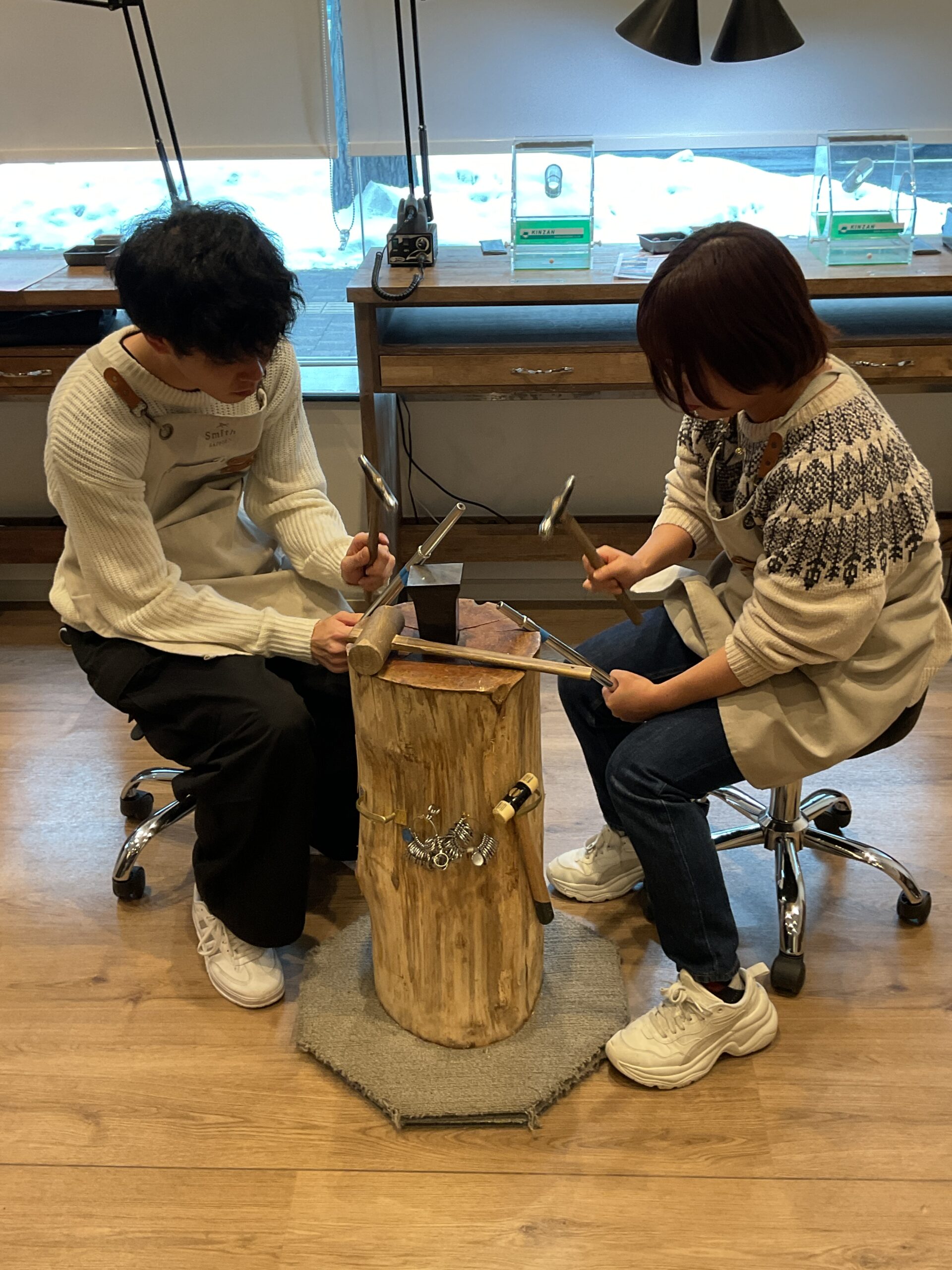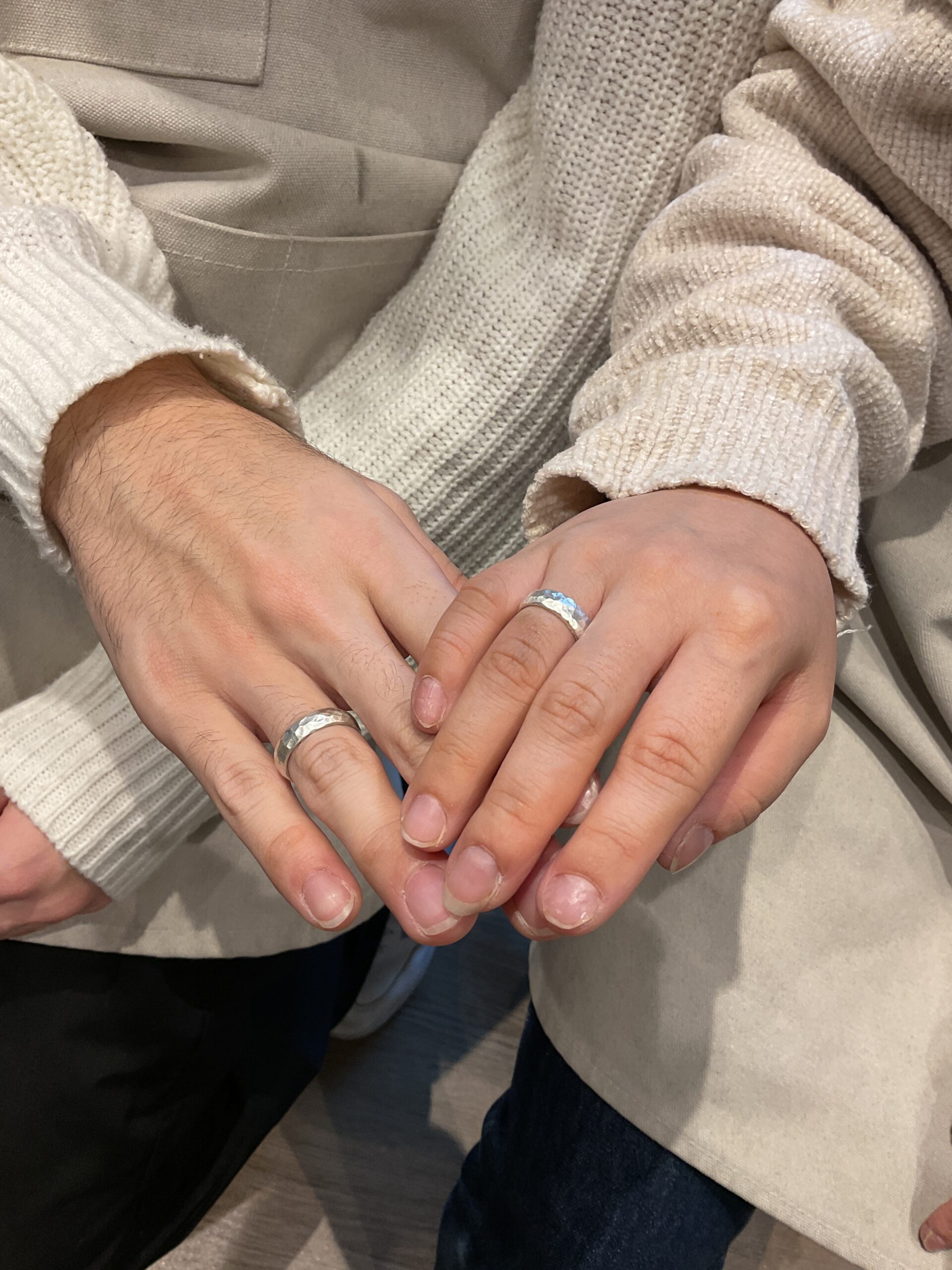 基本の形は5mmの甲丸リングにテクスチャーは鏡面とマットとハンマーをお選びいただきました。