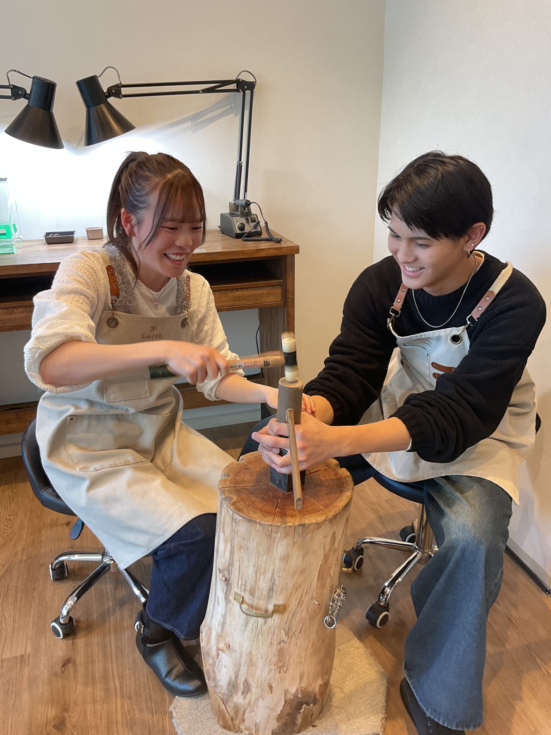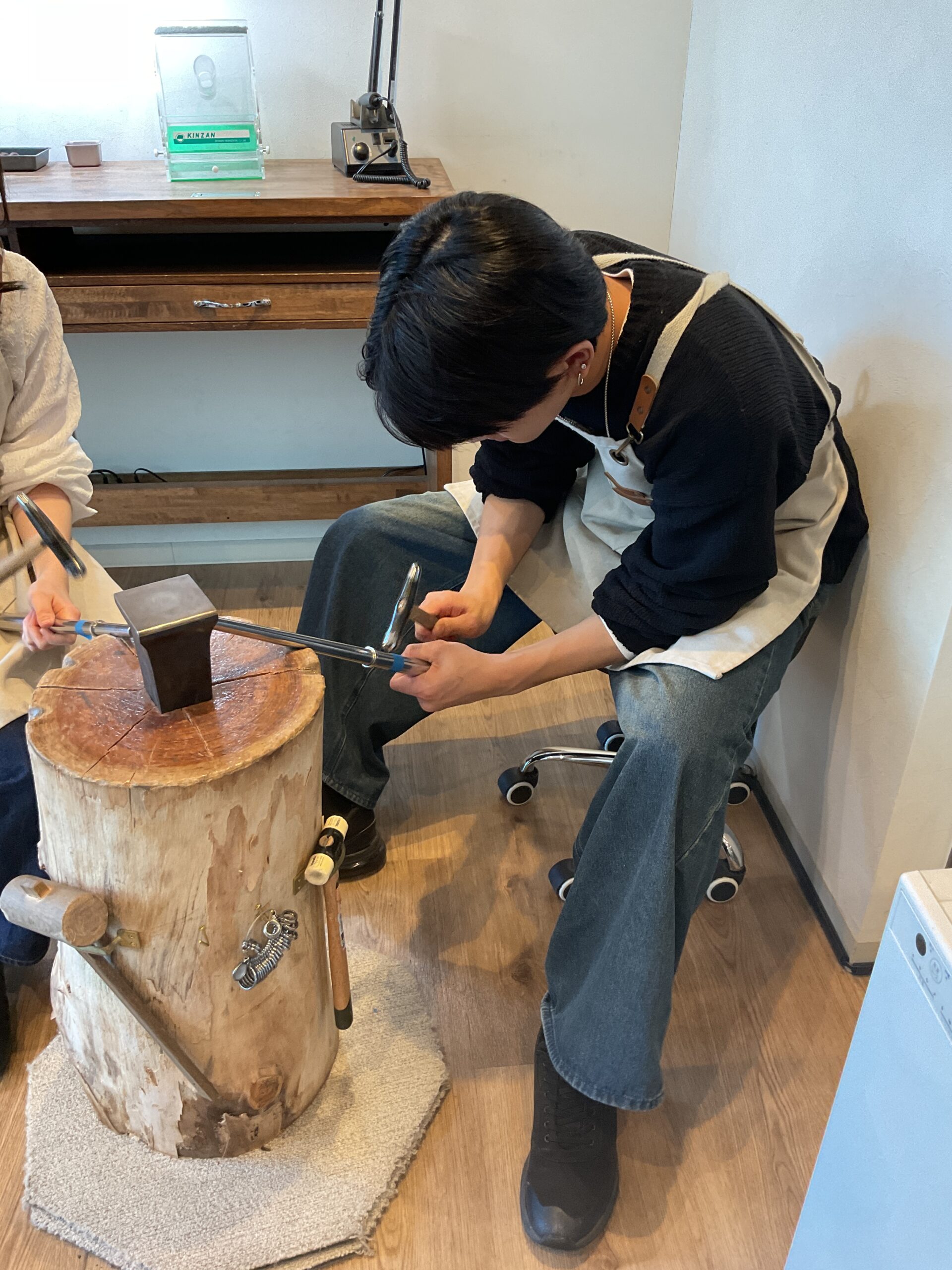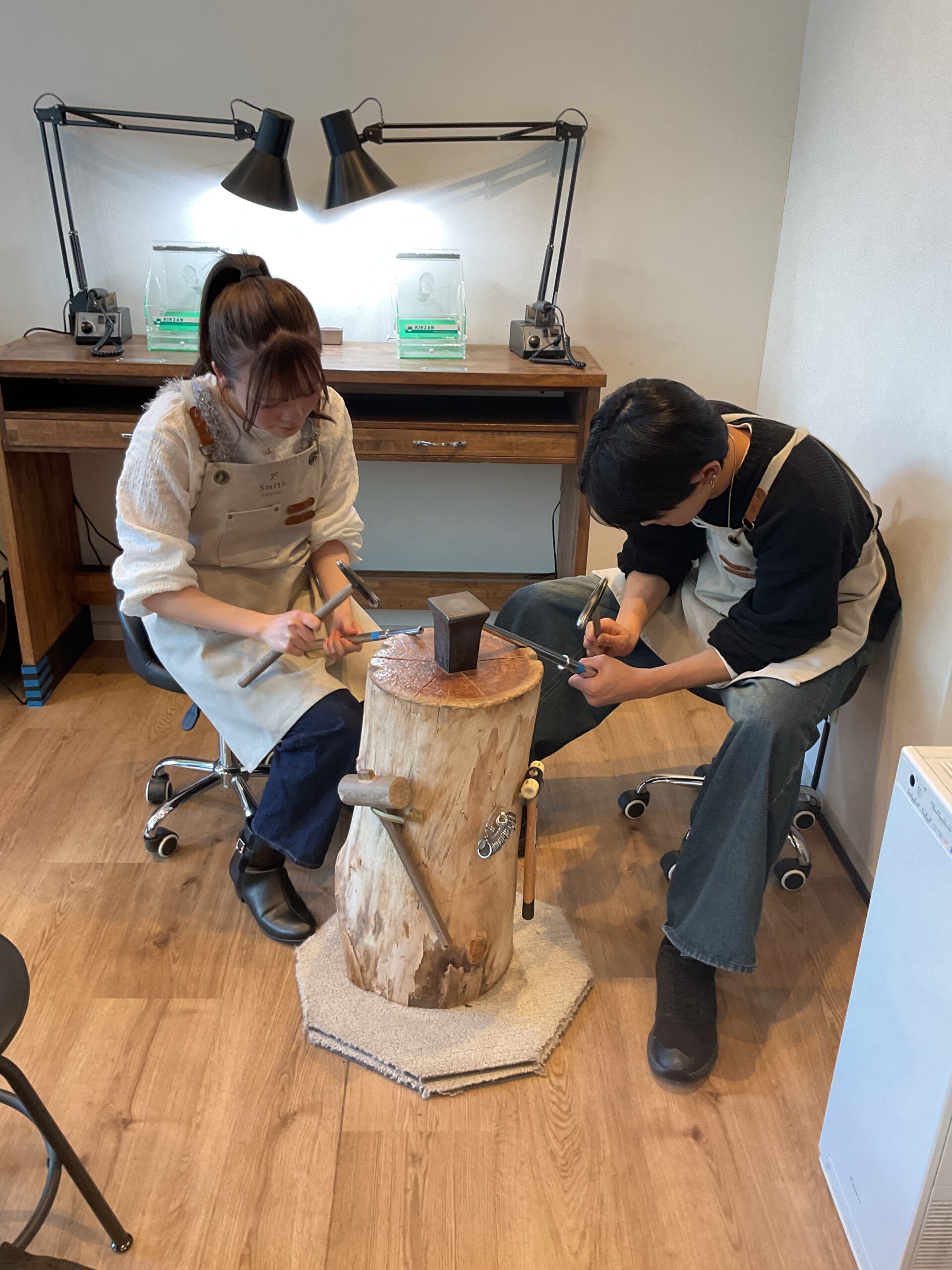 基本の形は3mmと4mmの平打ちリングにテクスチャーは鏡面とハンマーをお選びいただきました。