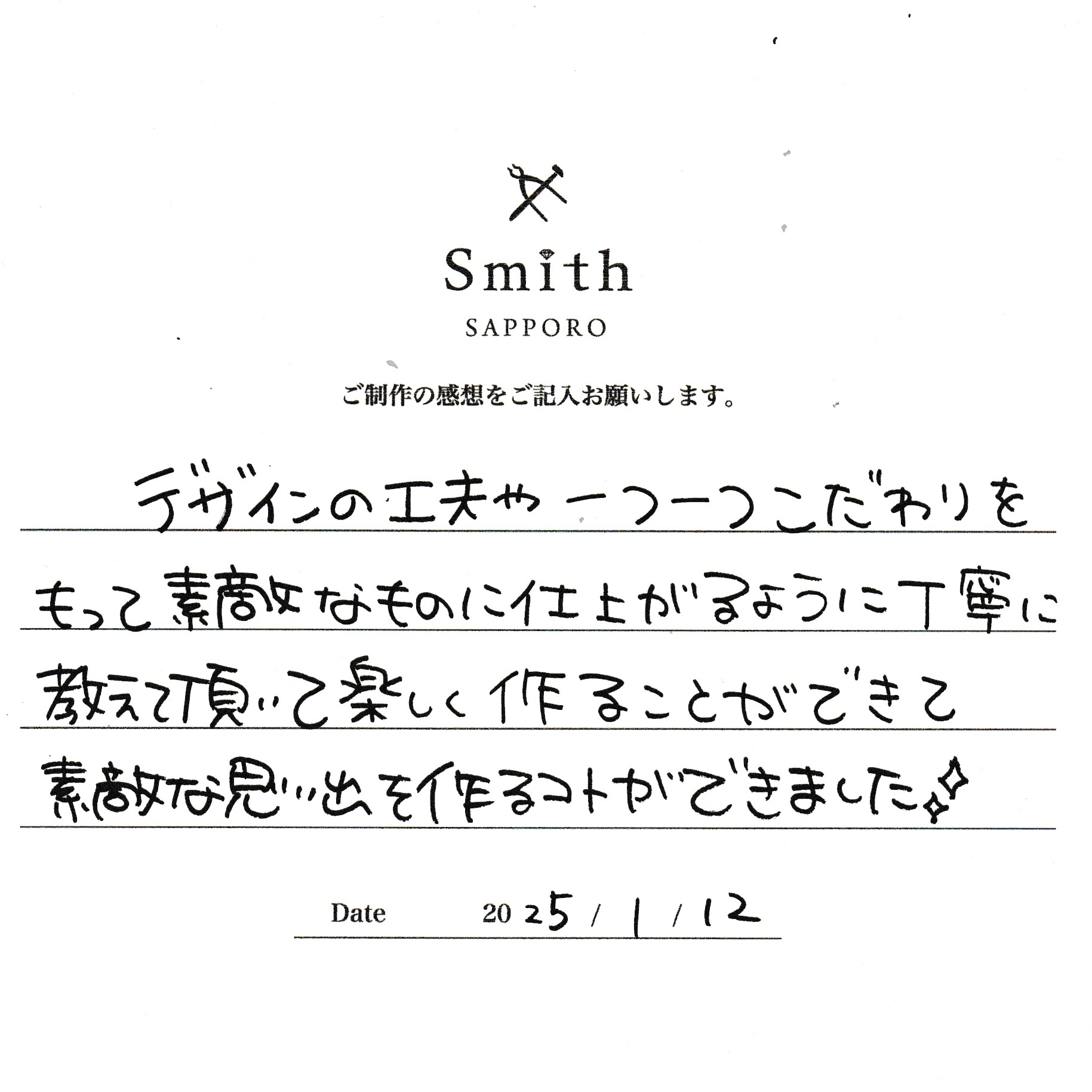 デザインの工夫や1つ1つこだわりを持って素敵なものに仕上がるように丁寧に教えて頂いて、楽しく作ることができて、素敵な思い出を作ることができました。