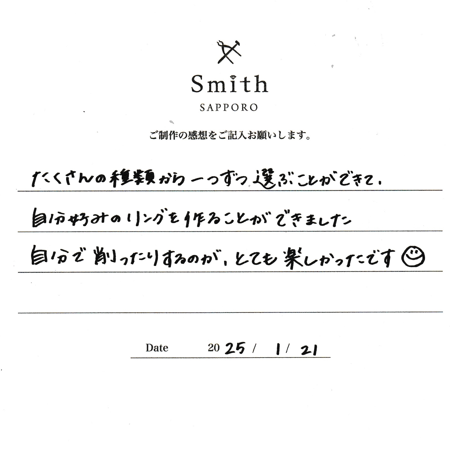 たくさんの種類から選びことができて、自分好みのリングを作ることができました。