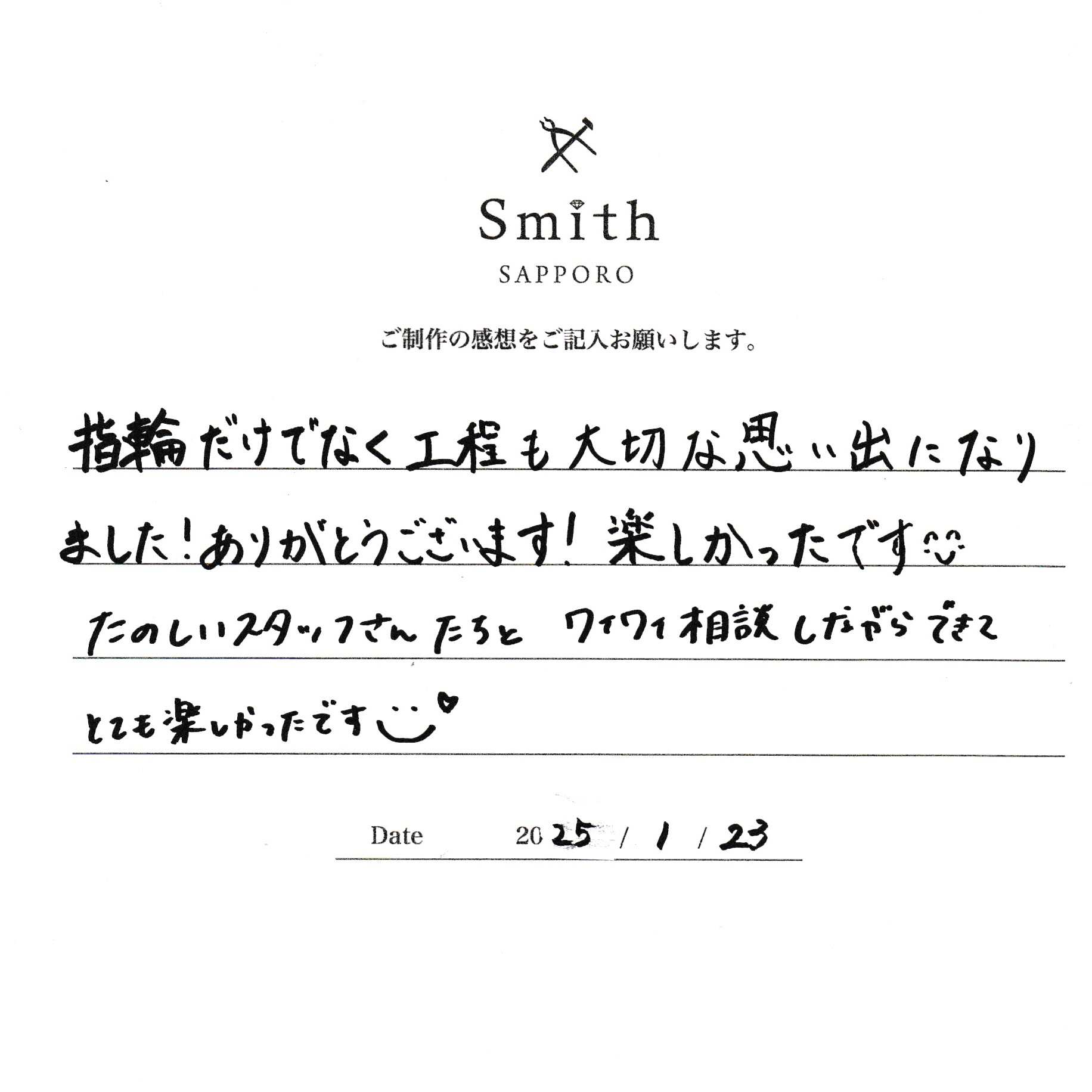 この度は手作り結婚指輪のご制作に、工房スミス札幌本店をお選び頂きまして、誠にありがとうございます。