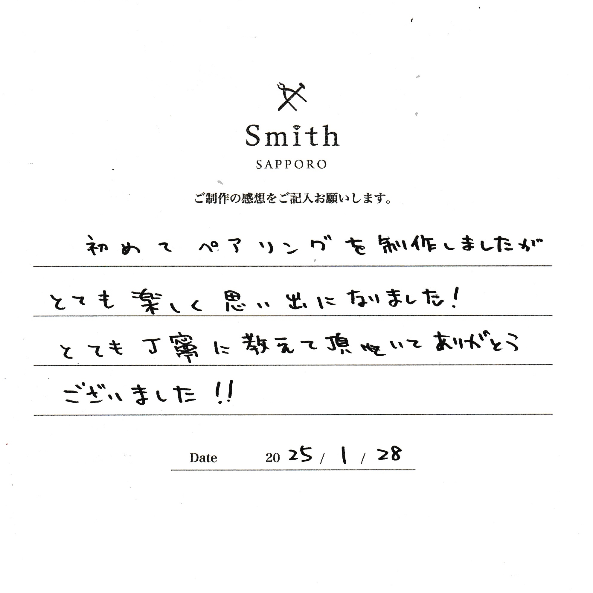 この度は、工房Smith京王プラザホテル札幌店で手作りペアリングのご制作誠にありがとうございました。