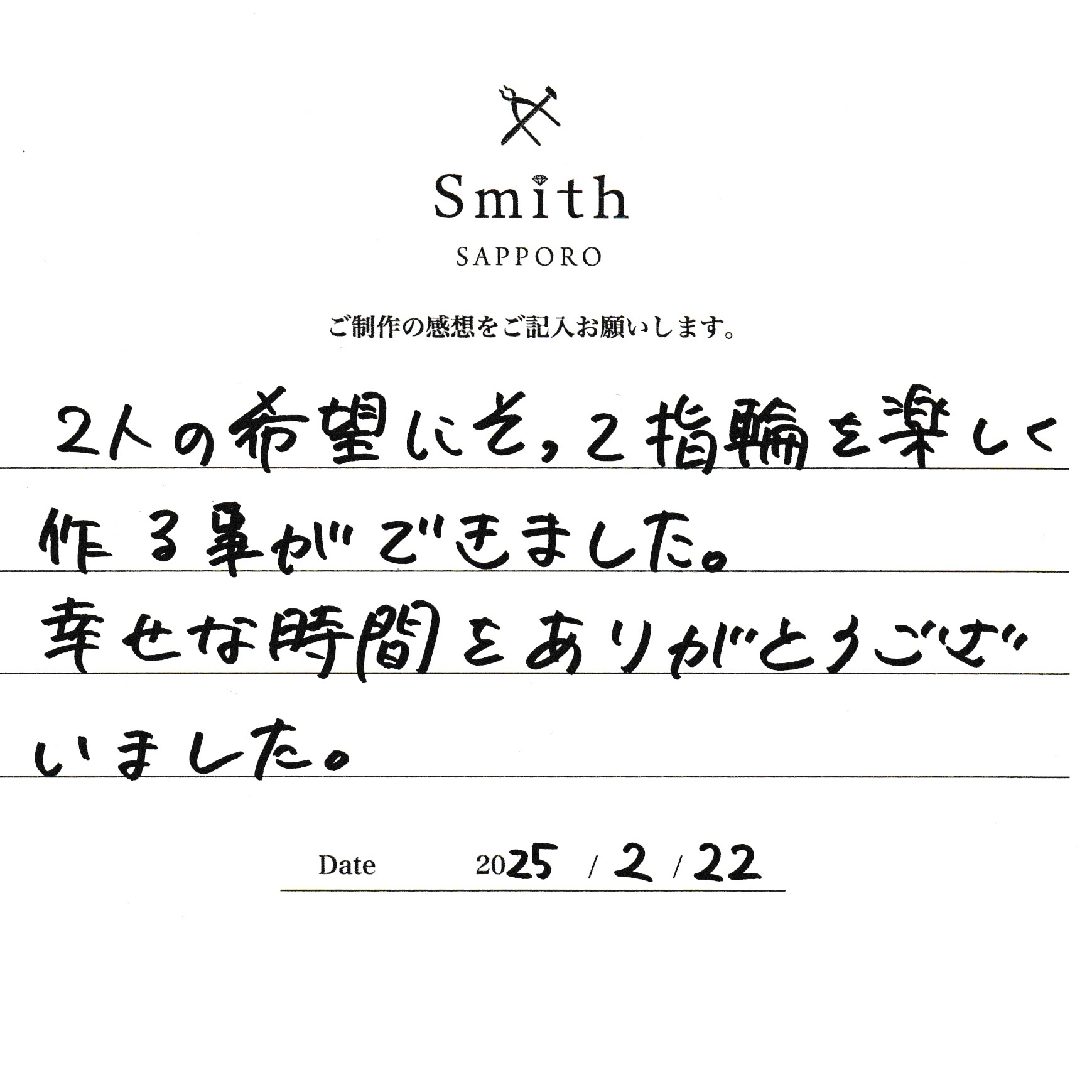 このたびは、手作りの結婚指輪の制作に工房Smithをお選びいただき、誠にありがとうございました。