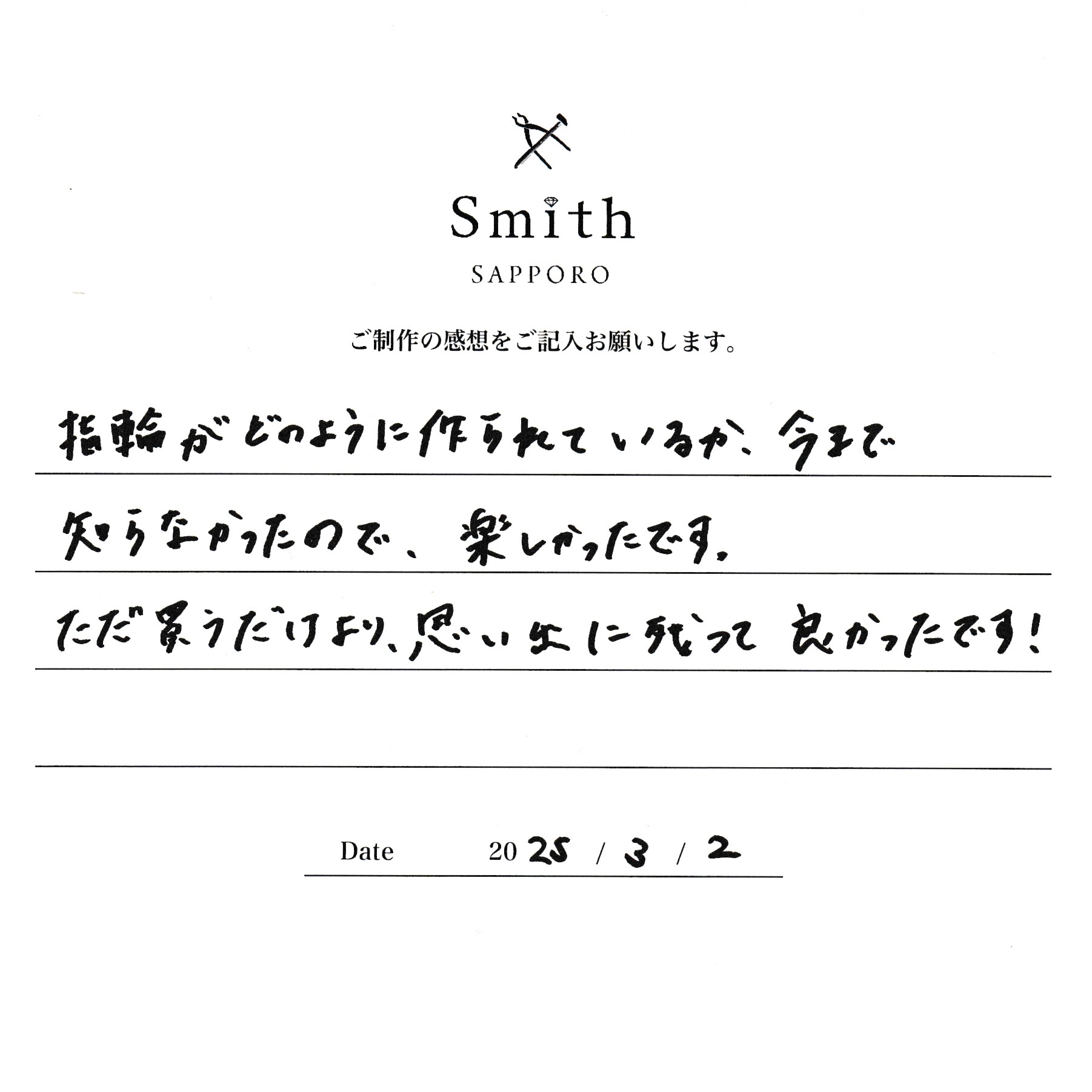 この度は工房スミス札幌店の手作りご結婚指輪、ご婚約指輪をお選びいただきまして誠にありがとうございます。