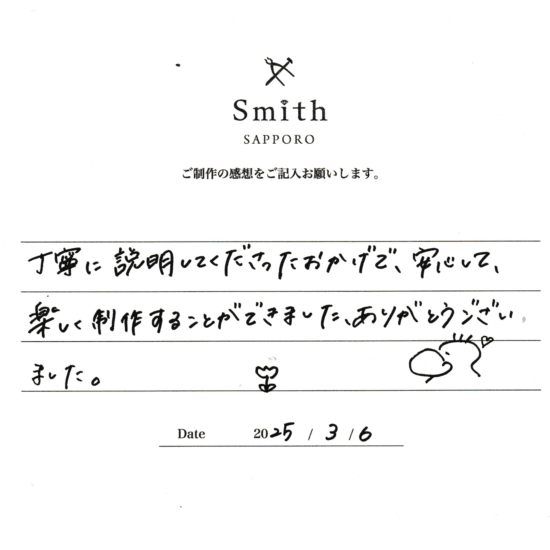丁寧に説明してくださったおかげで、安心して楽しく制作することができました。