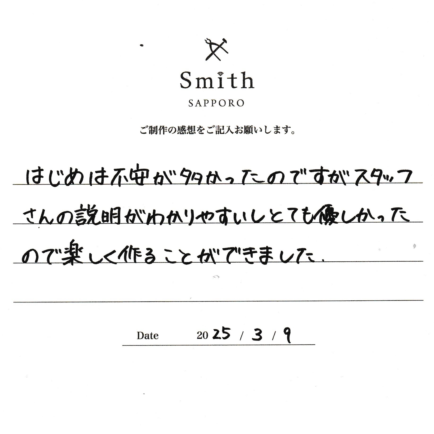 はじめは不安が多かったのですがスタッフさんの説明がわかりやすいしとても優しかったので楽しく作ることができました。