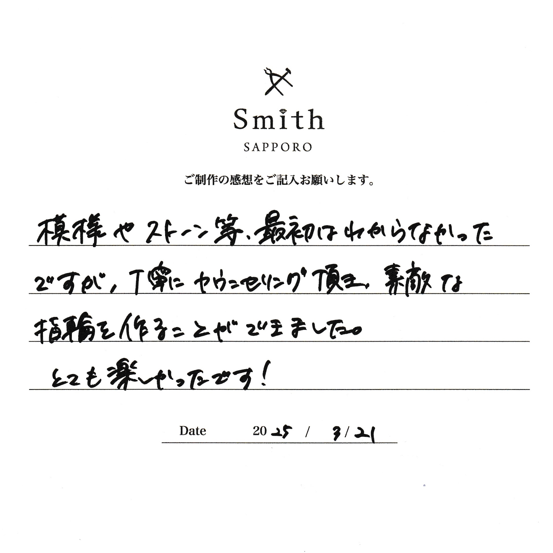 模様やストーンなど、最初は分からなかったですが、丁寧にカウンセリングいただき素敵な指輪を作ることができました。
