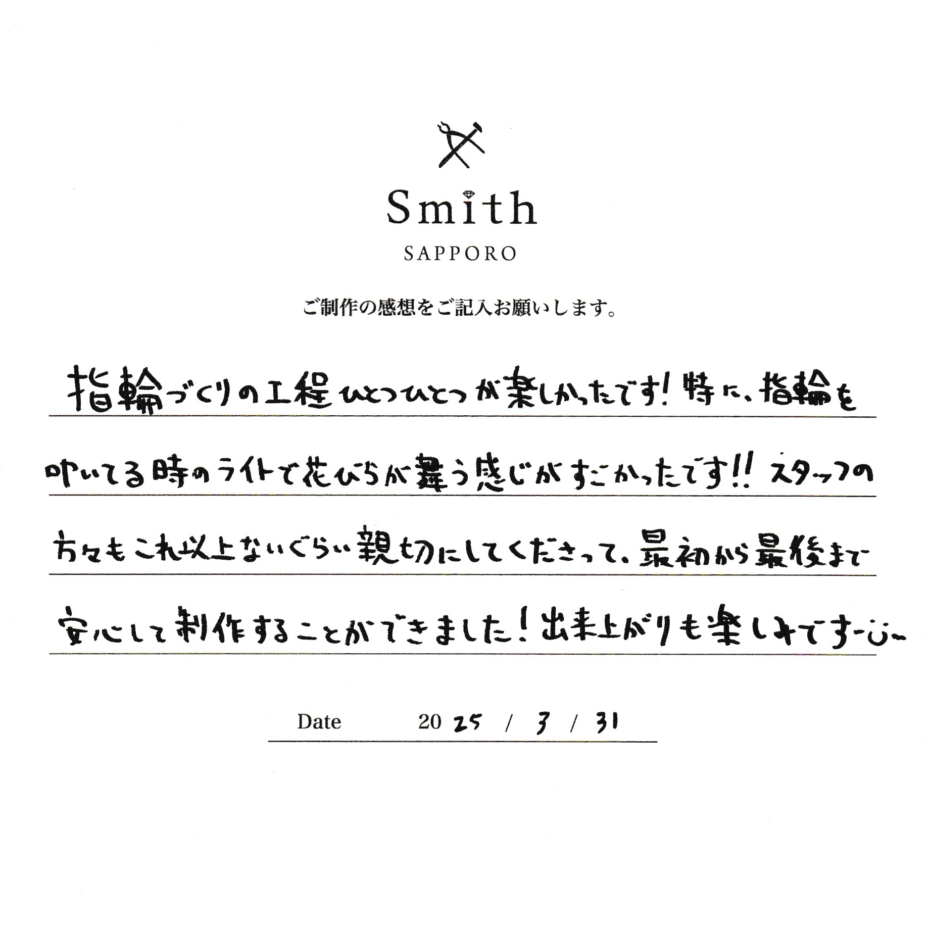 本日は手作り結婚指輪の制作にお越しいただき、ありがとうございました。
