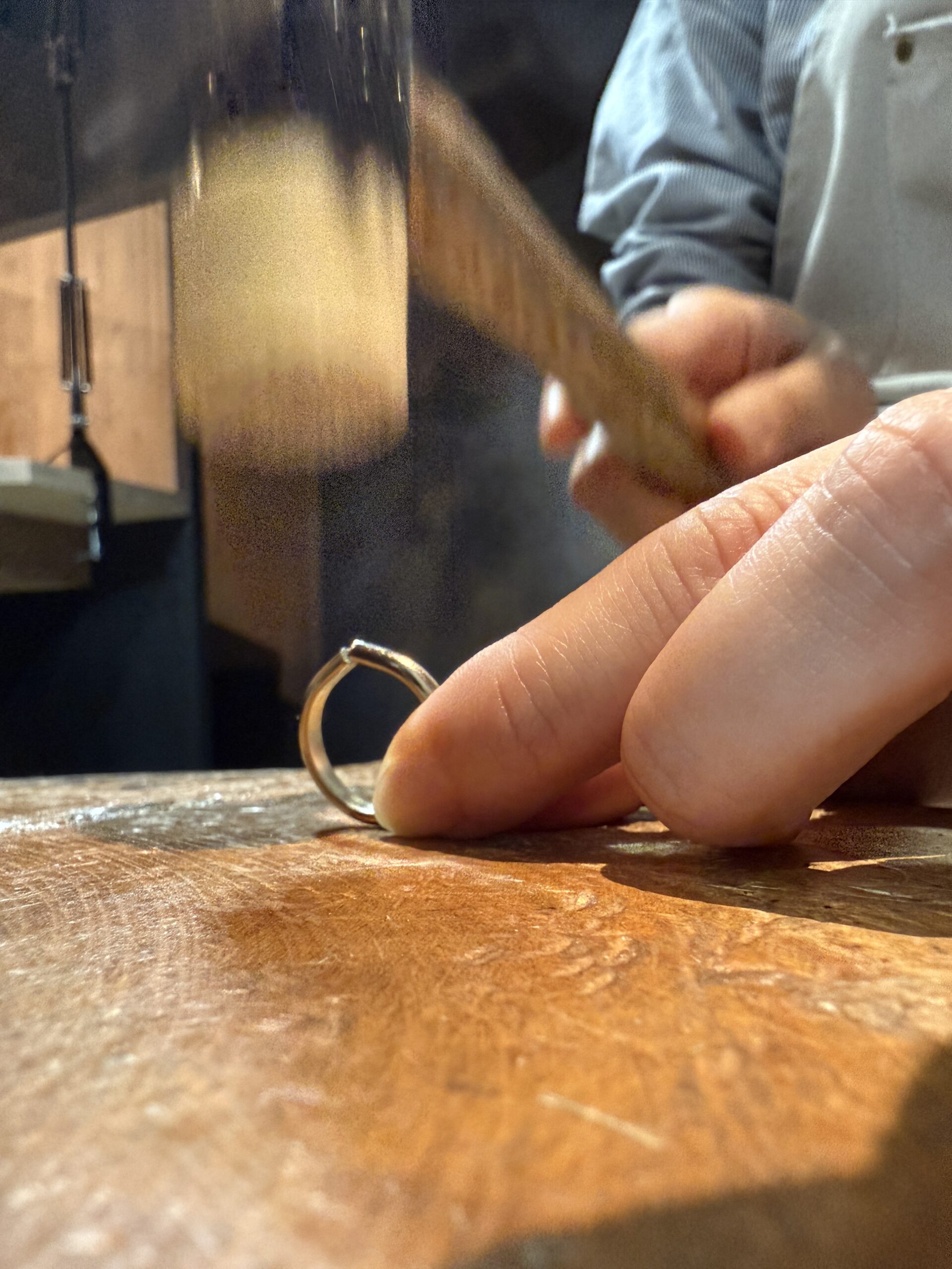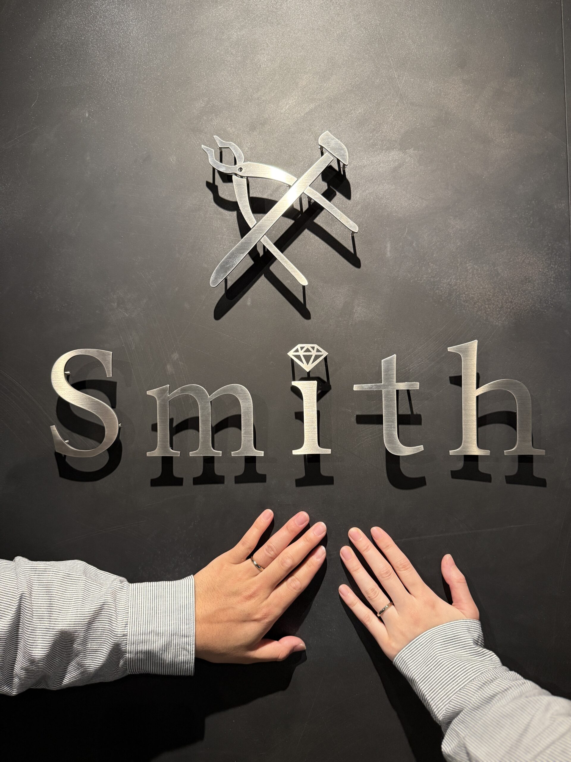 打ち合わせでは、仲良くハンマー模様を気に入って下さいました、シンプルがお好みの奥様と、オシャレにワンポイントでダイヤを入れたいご主人。どちらも素敵なデザインだと感じました!