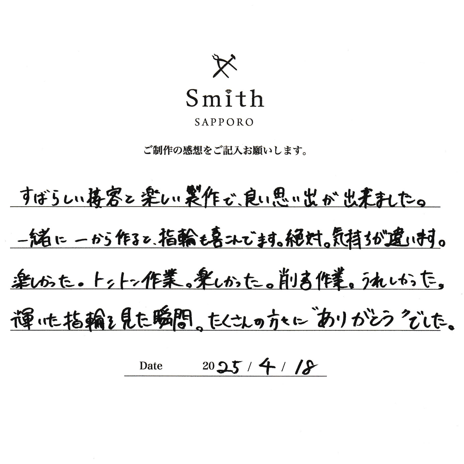 すばらしい接客と楽しい制作で良い思い出が出来ました。