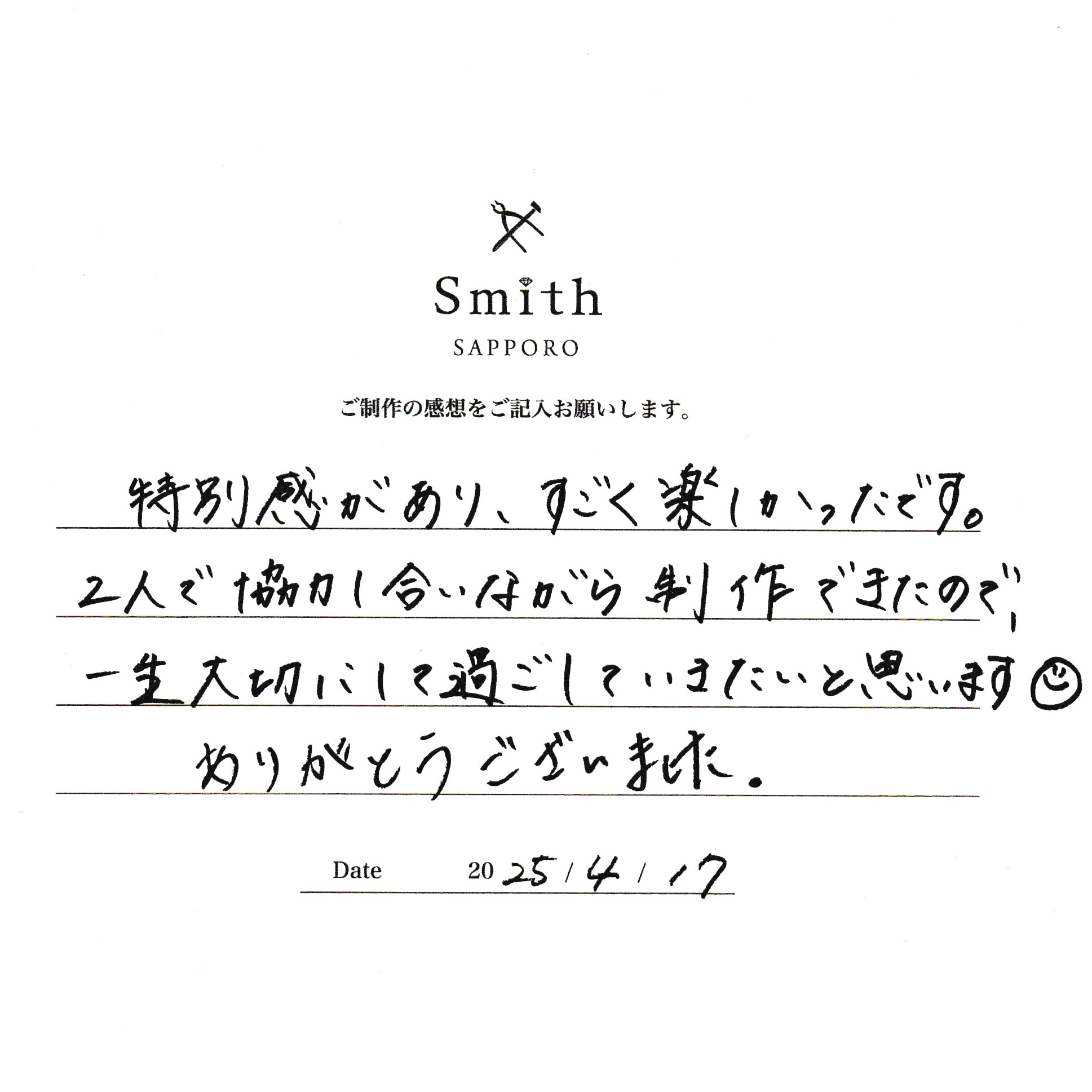 この特別な時間や思い出も手作りリングならではです。きっとお二人にとって特別な結婚指輪になることでしょう。出来上がりを楽しみにお待ちくださいませ。