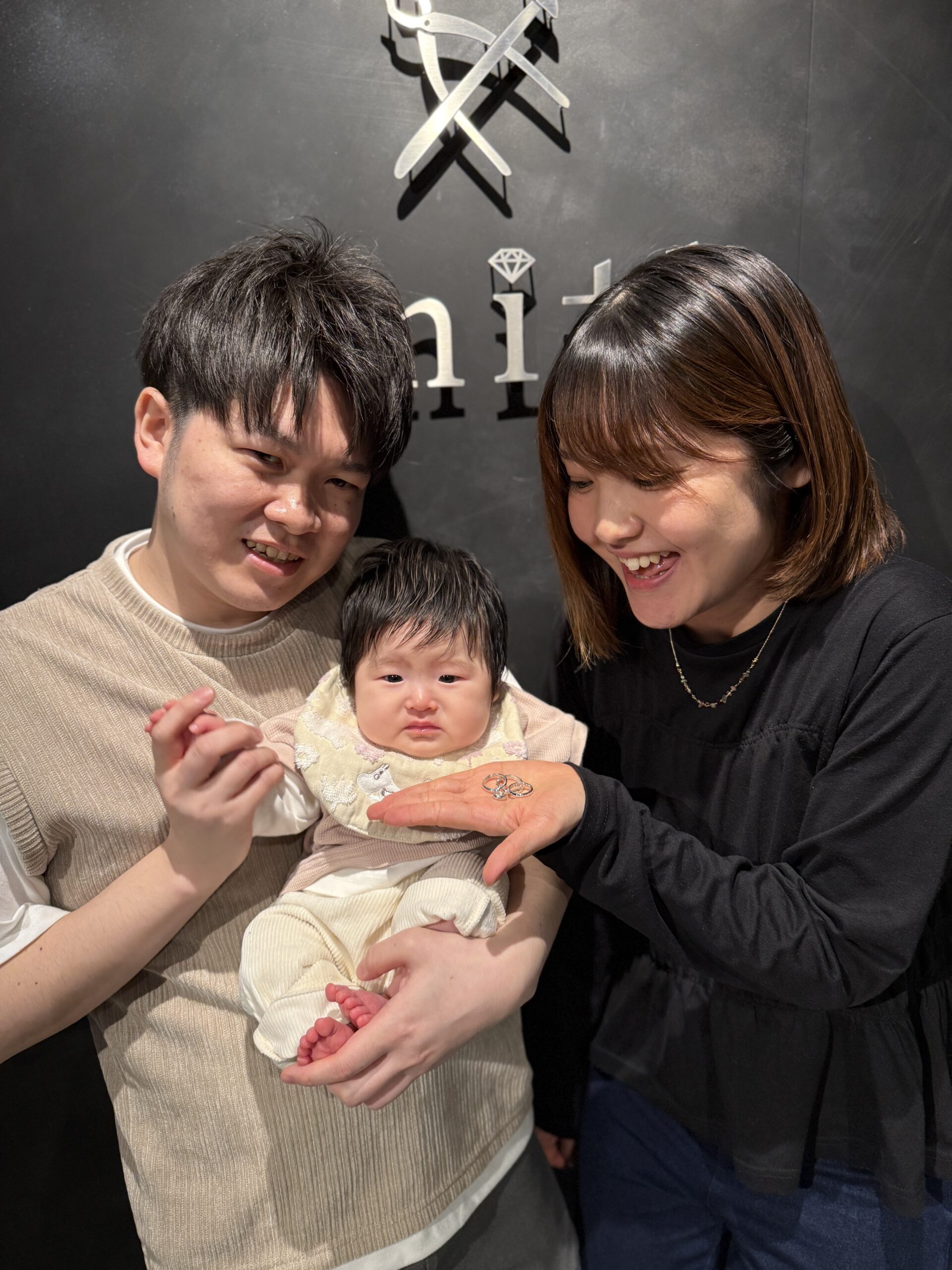 ご夫婦のペアリングと共に、3ヶ月の娘さんの指輪を作りにいらして下さいました。