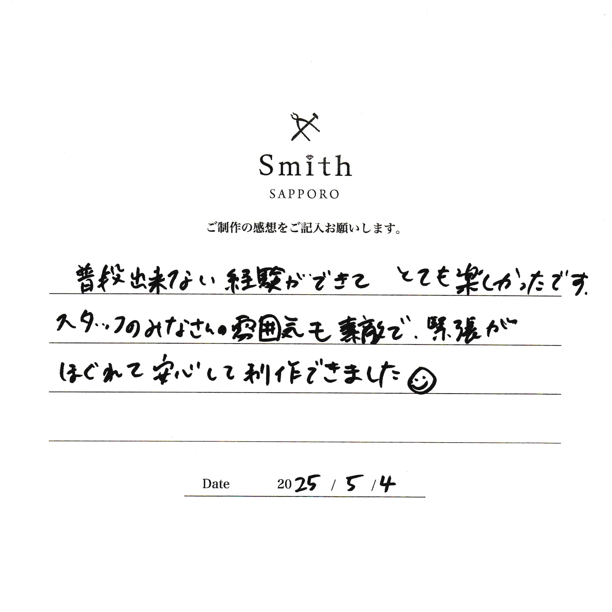 結婚指輪は手作りしてみない?とご主人がお誘いしたという素敵なエピソードもお聞きでき、幸せのお裾分けをいただきました。