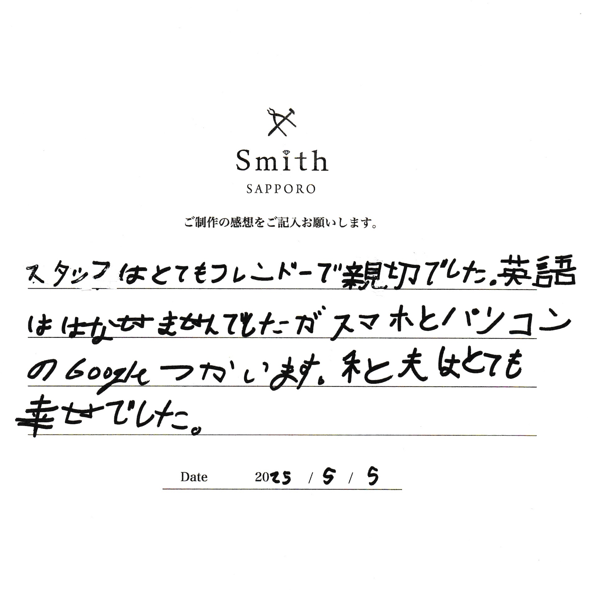 遠い北海道で作った指輪作りがお二人の素敵な思い出になってくれると嬉しいです!ハワイご出身のお二人は日本語ができませんが、感想は奥様が、一生懸命日本語を調べながら、頑張って書いてくれました!とっても嬉しかったです!