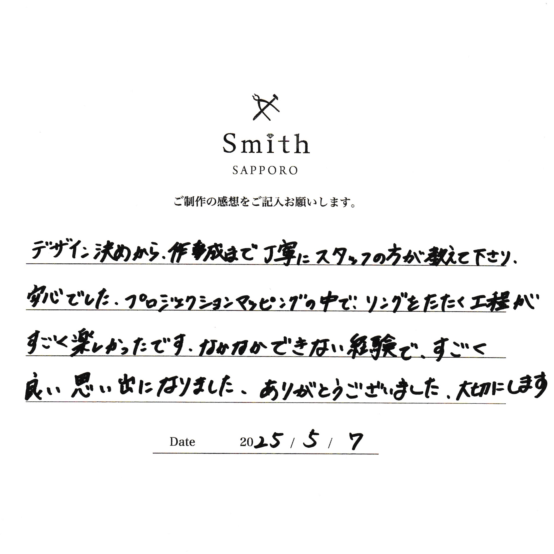 この度は手作りペアリング制作にお越しいただき、誠にありがとうございました。